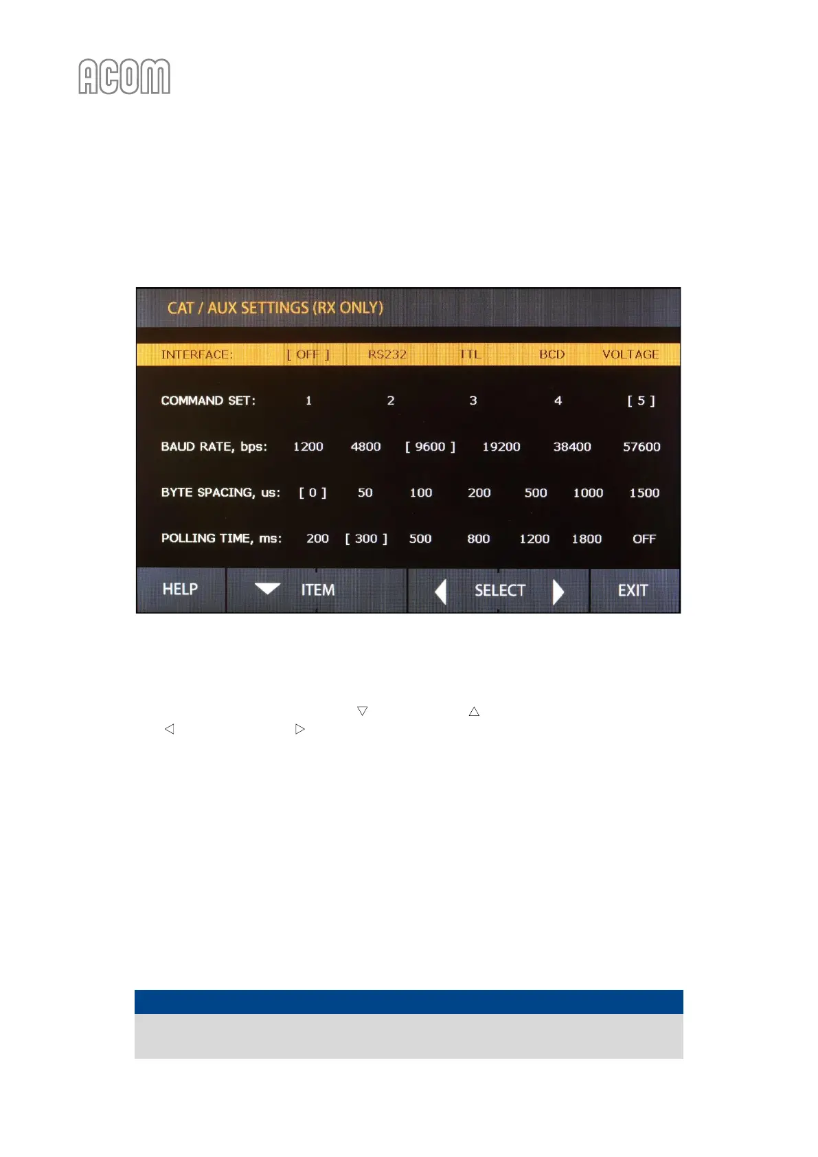 The CAT settings are accessible only in RX mode (see Figure 5-1 | MENU SELECTION and Figure 5-4 | Menu