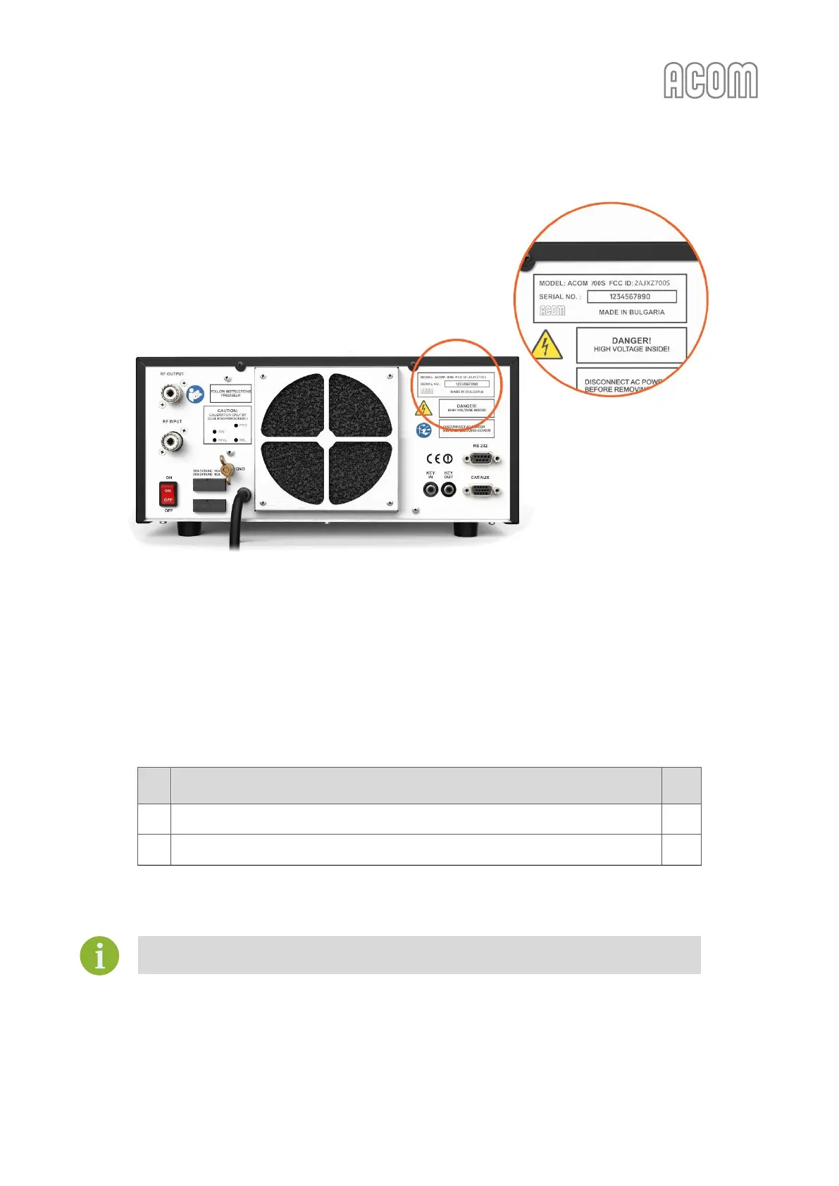 The ACOM 700S amplifier is shipped as package, consisting of: