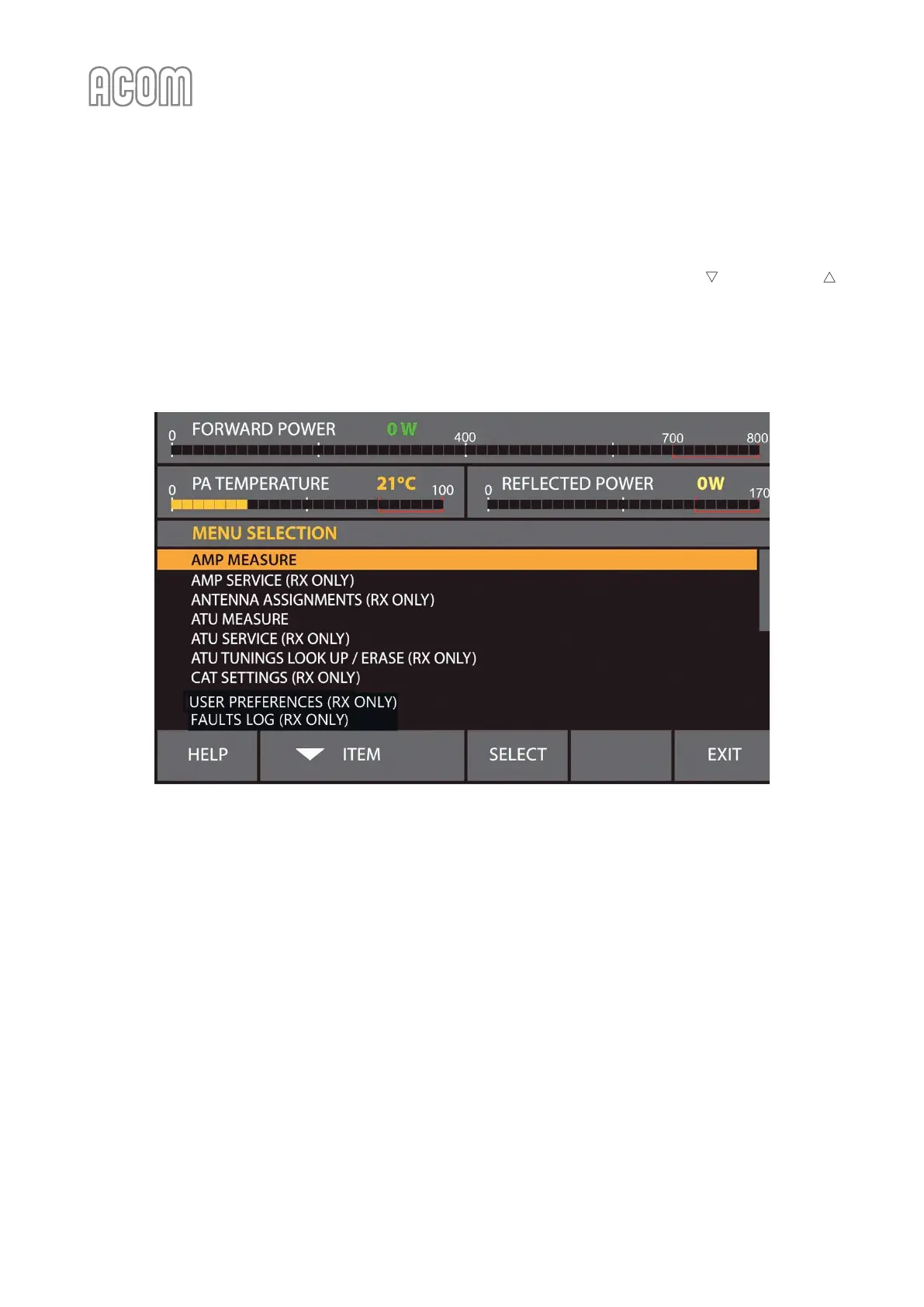 SELECTION screen (see Figure 5-1 | MENU SELECTION). Each menu can be selected by the ITEM or ITEM