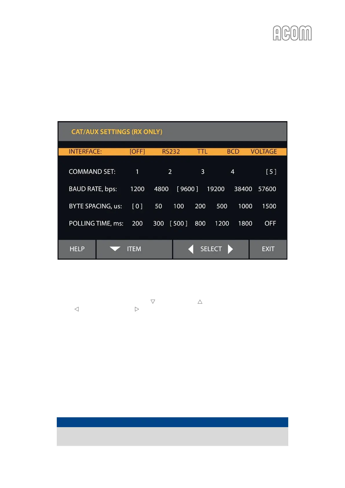 The CAT settings are accessible only in RX mode (see Figure 5-1 | MENU SELECTION and Figure 5-4 | Menu