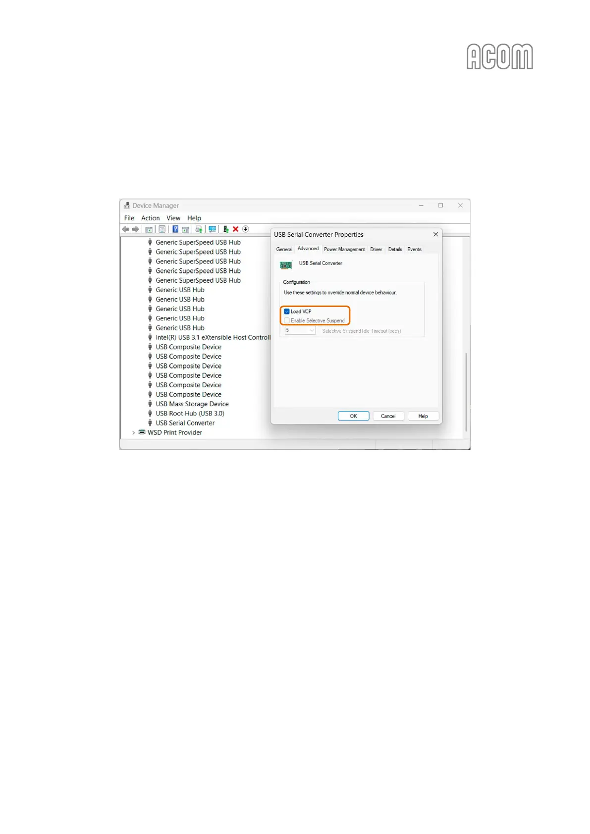 Below are shown the recommended settings (VCP = Virtual Com Port):
