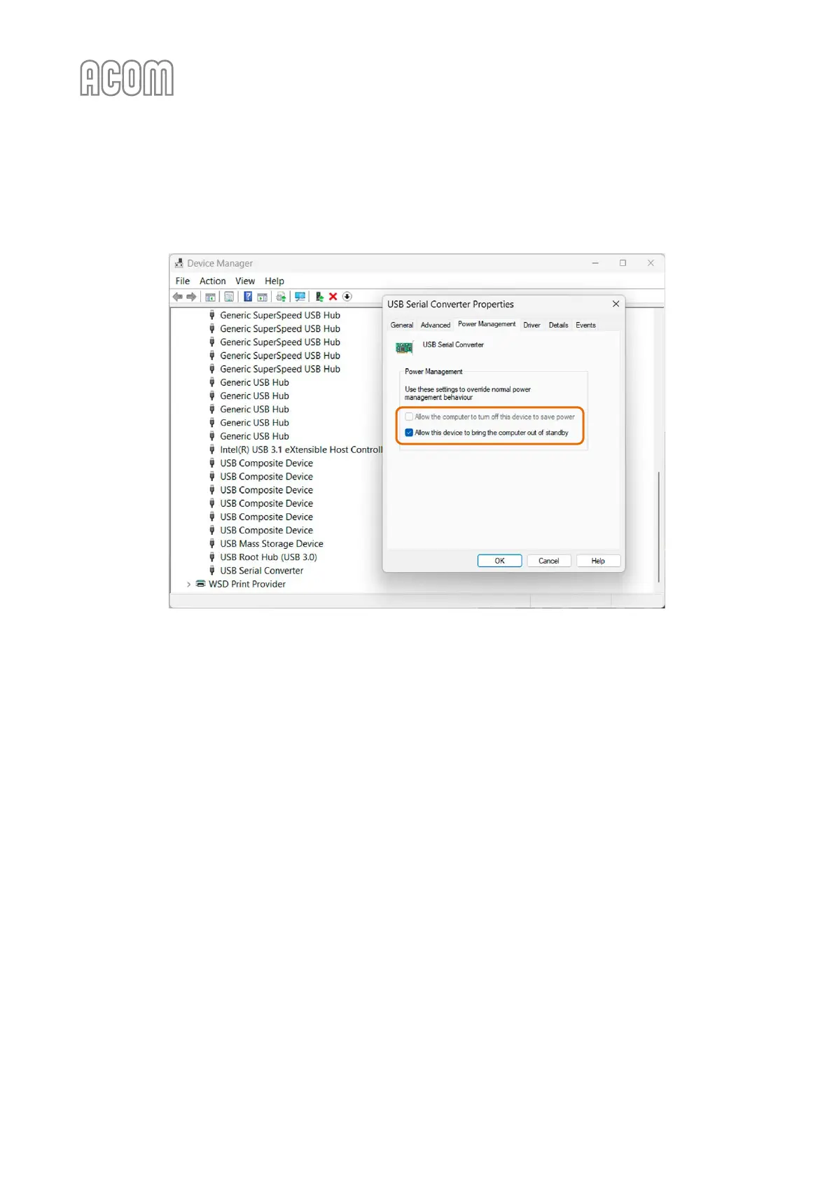 Acom 700S - Figure 7-23 | Windows Device Manager - Power Management