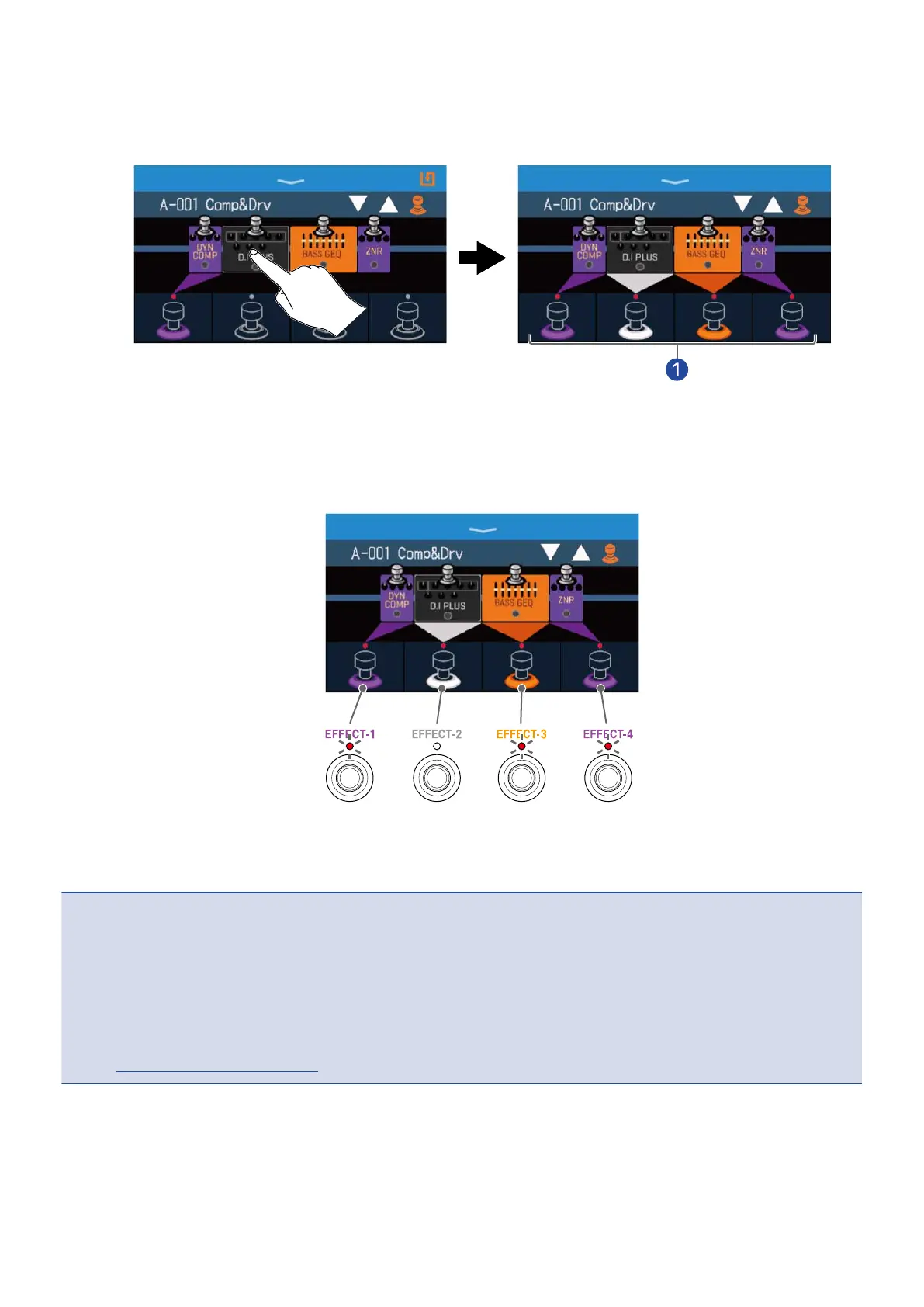 • Regardless of the order that the effects are touched, they are assigned to the footswitches from the left.