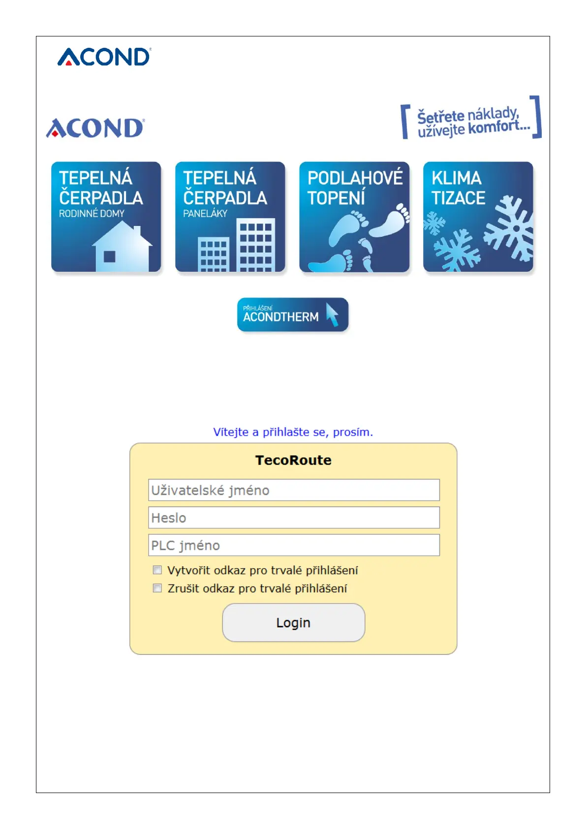 Figure 1 Website of Acond a.s. with login to the heat pump (longitudinal tile at the