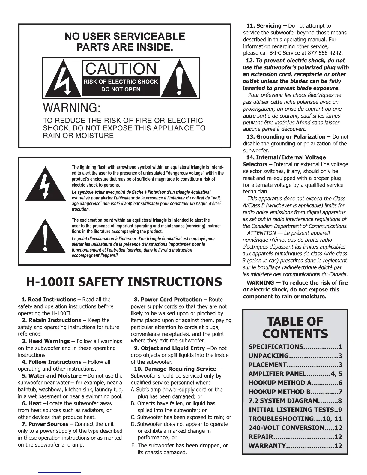 Acoustech H-100II - H-100 II Safety Instructions; General Operating Safety; Environmental & Electrical Safety; Servicing & Damage Prevention