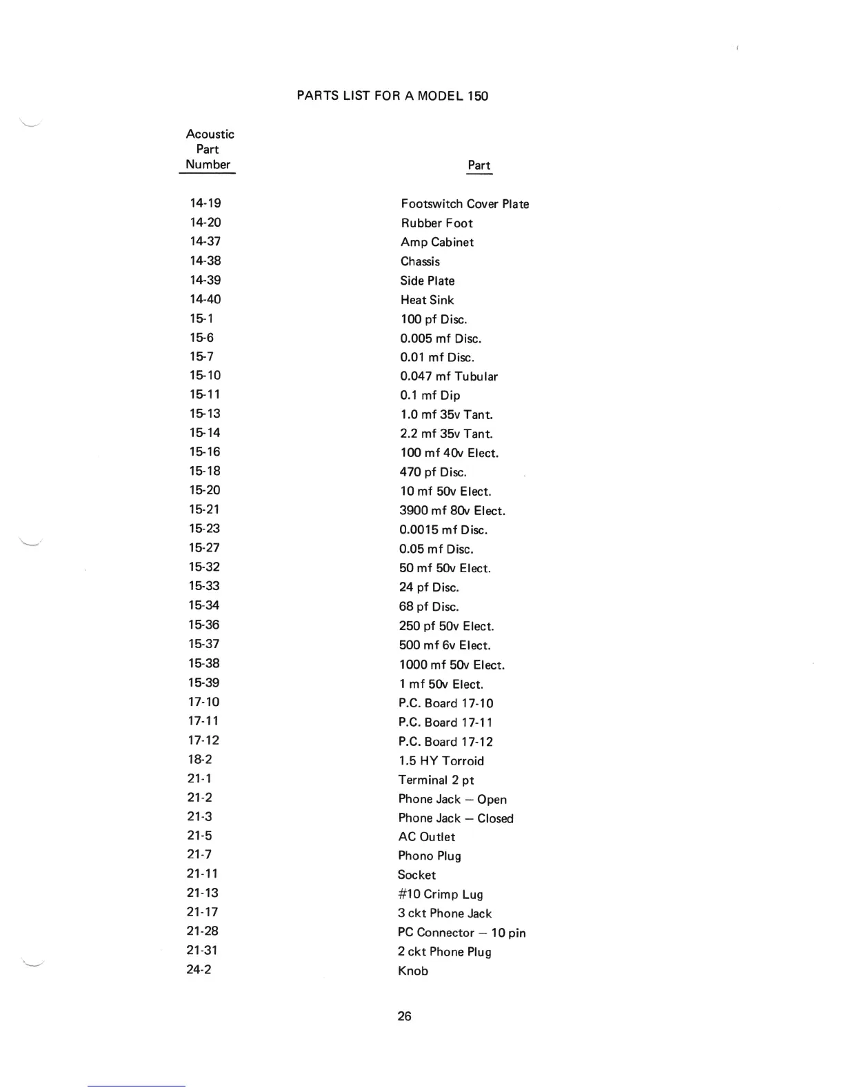 Acoustic 150 - Parts List