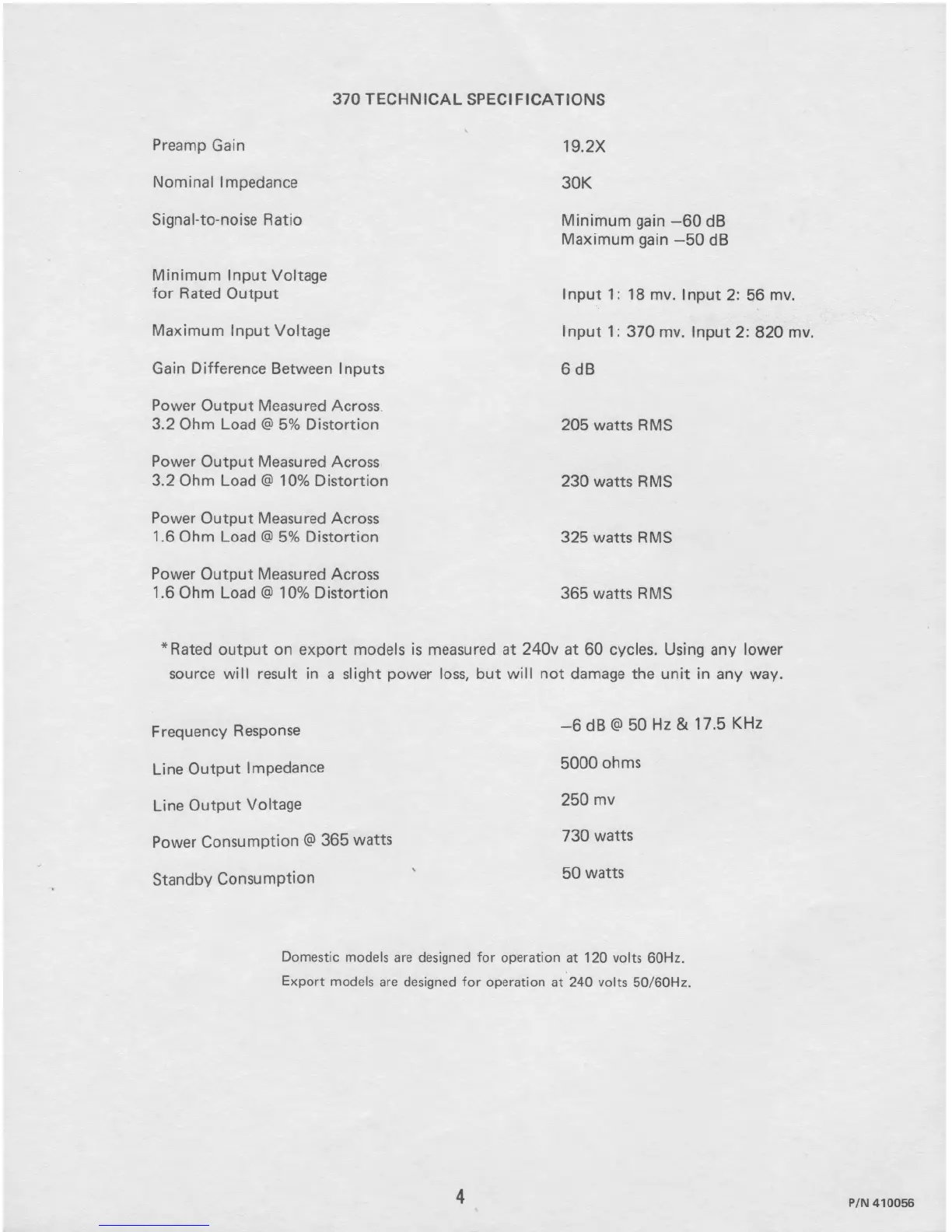 Acoustic 370 - Acoustic 370 Technical Specifications; Performance and Electrical Specifications; Frequency Response and Power Usage