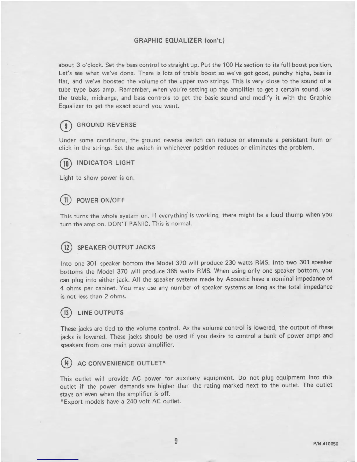 Acoustic 370 - Additional Amplifier Controls; Ground Reverse, Indicator, and Power Controls; Output Jacks and Auxiliary Outlet