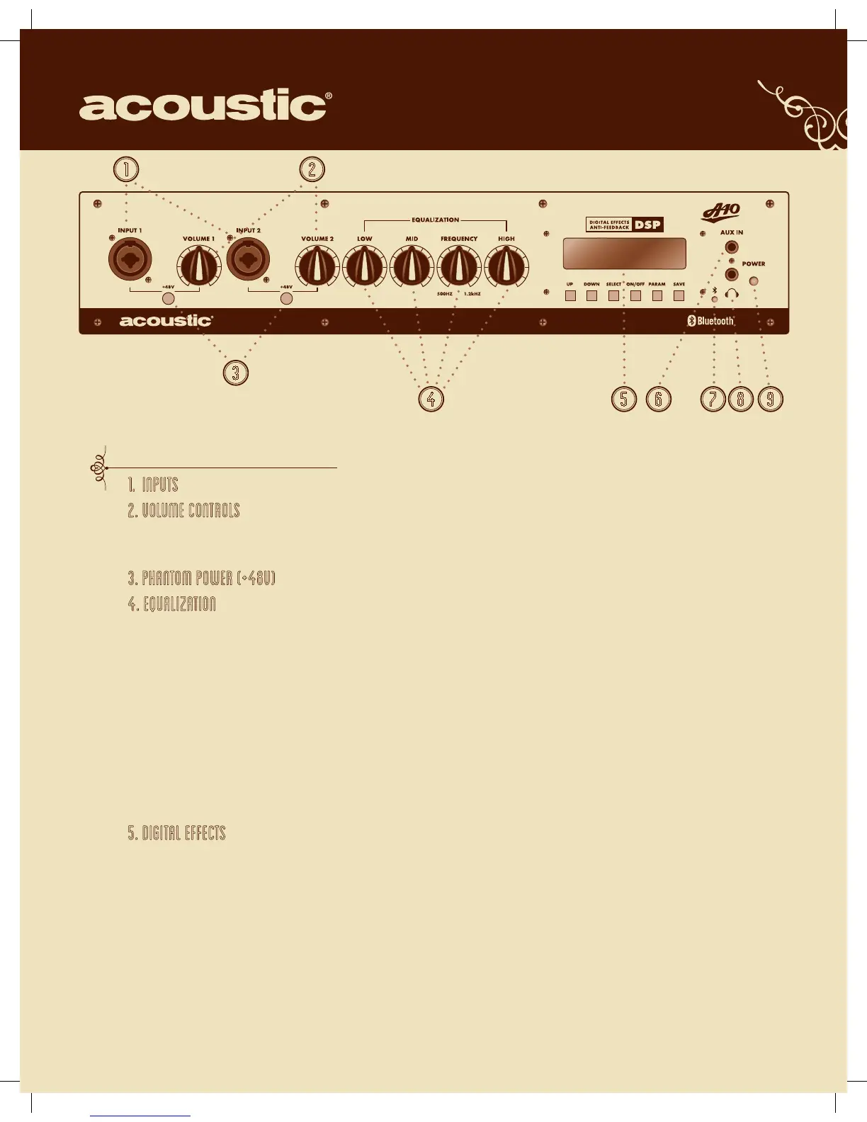 1. INPUTS – combination ¼” (2-conductor instrument cable) or XLR (3 or 4-conductor microphone)