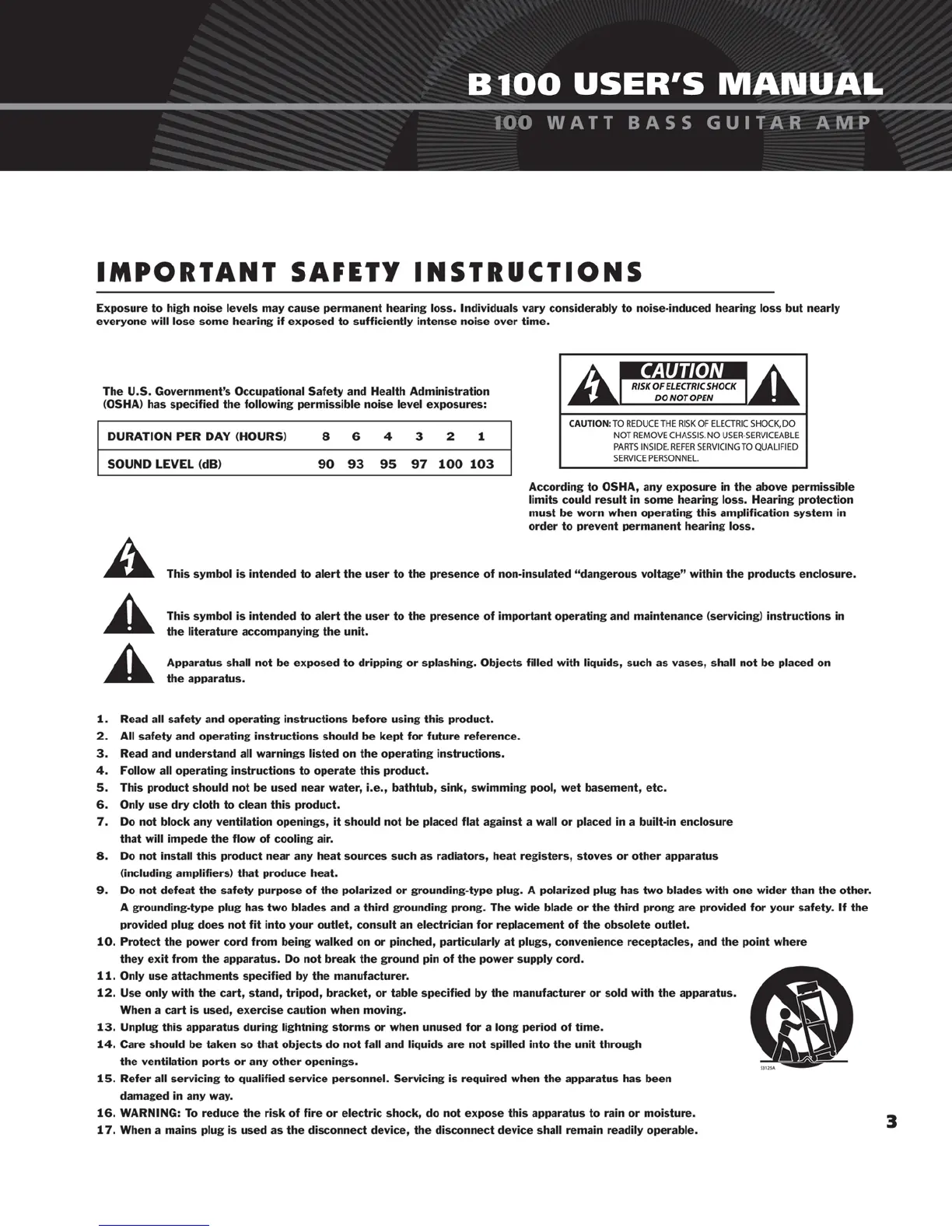 Acoustic B100 - Important Safety Instructions; General Safety Precautions; Electrical Shock Hazard Warning
