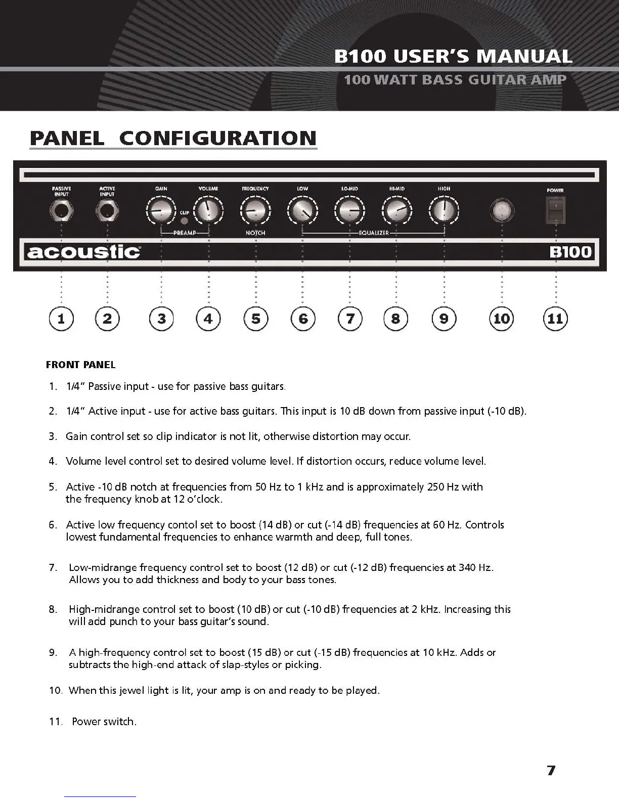 Acoustic B100 - Front Panel Configuration; Input and Gain Controls; Volume and Equalizer Controls; Power Indicator and Switch