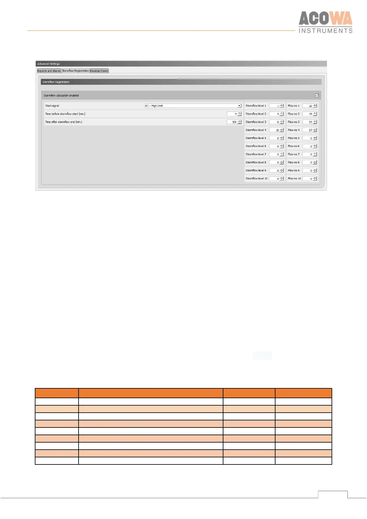 The table is filled with a column for levels and a column with the flow value that matches the entered level.