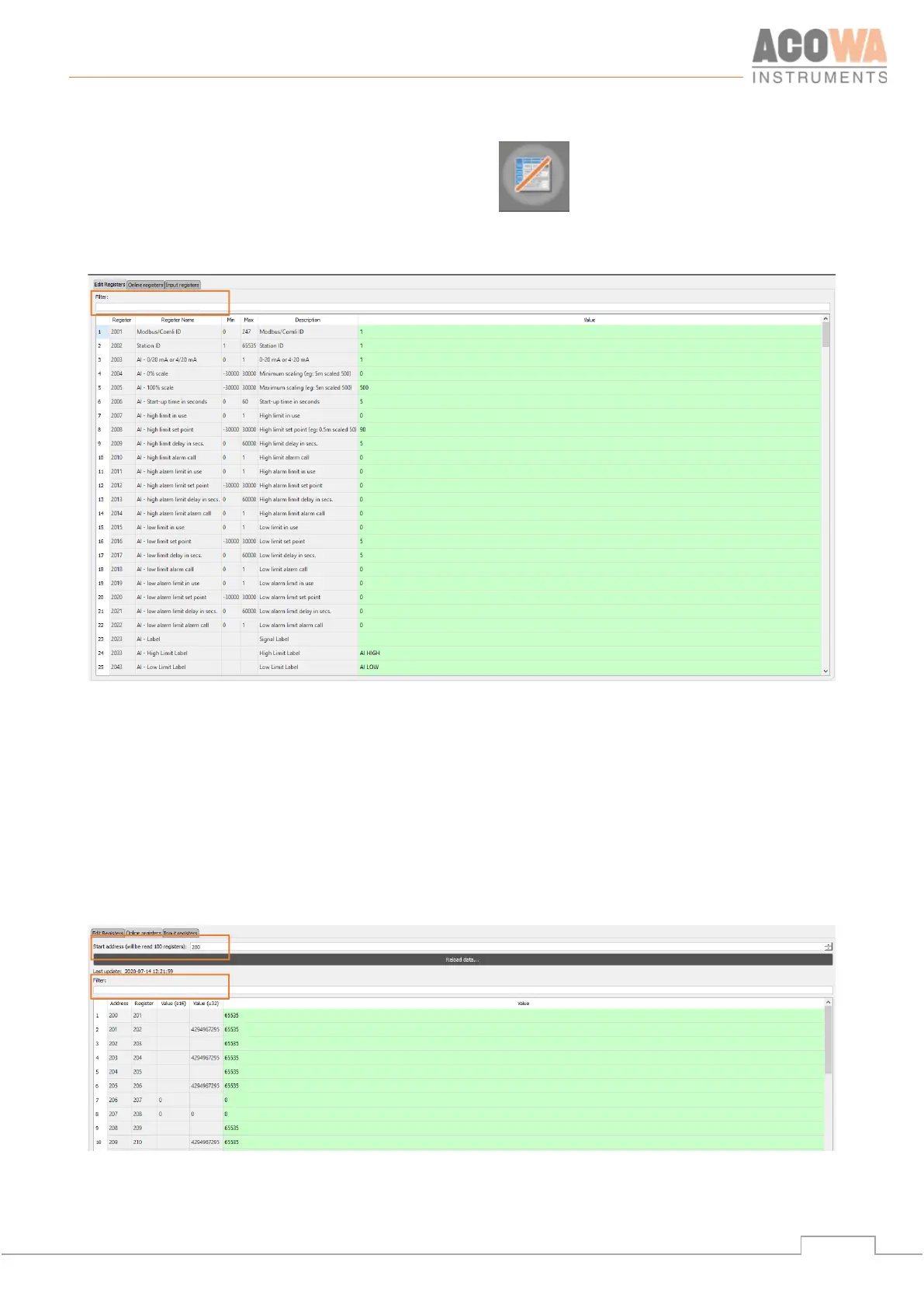 desired address and the subsequent 100 registers are found. The filter function shows the specific search