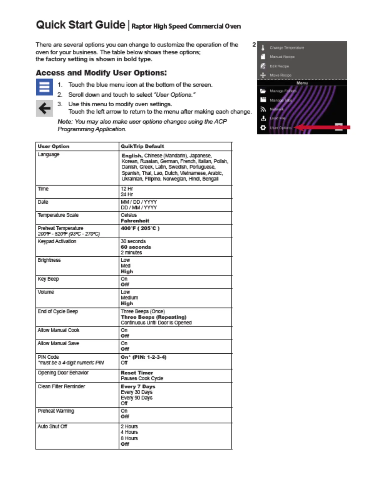 ACP MRX2QT - Quick Start Guide: User Options; Customizing Oven Settings