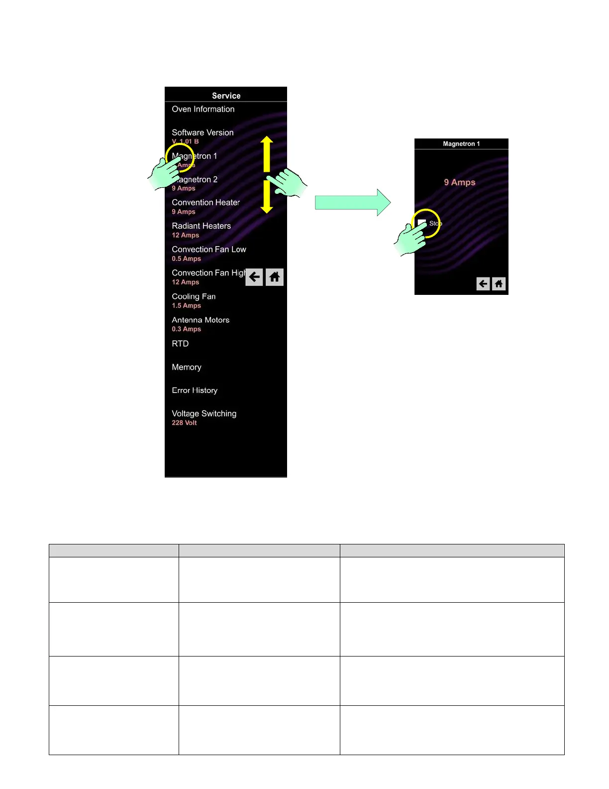 example of Magnetron 1 (Right Side) below, by touching start to start or stop to stop. Pressing the “back