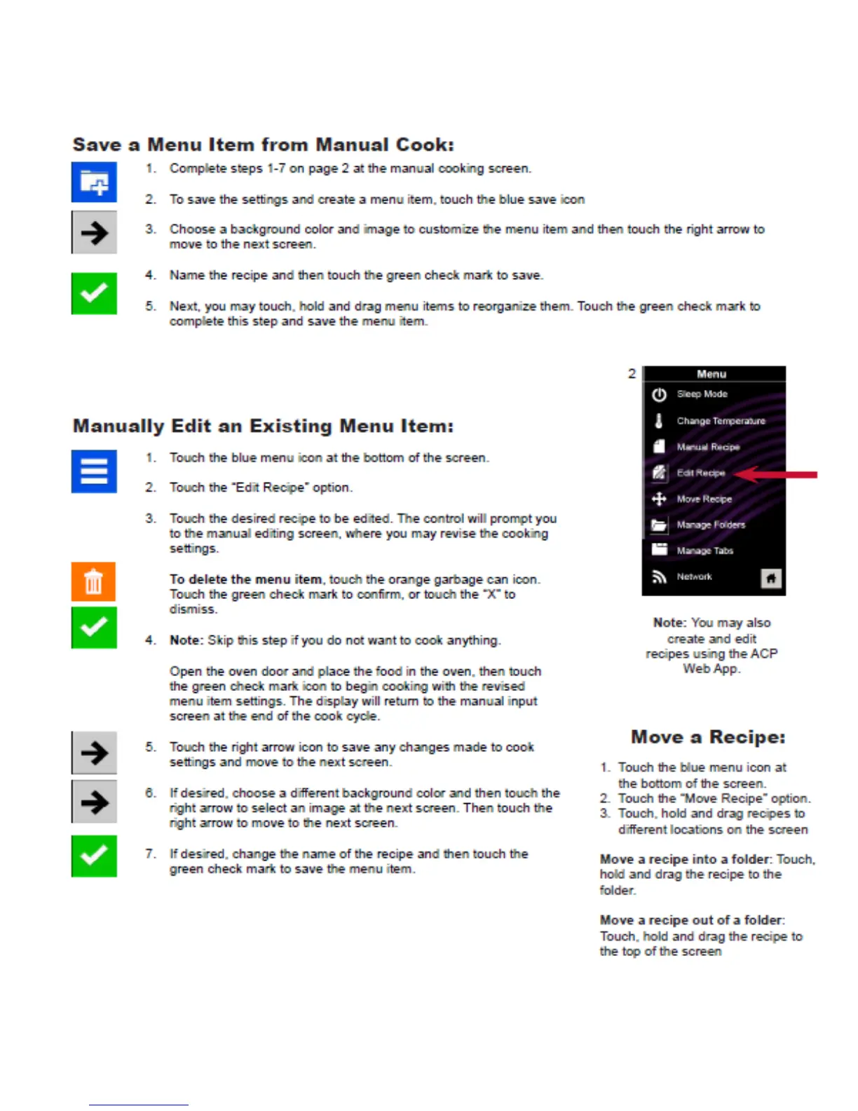 ACP MXP22QTT - Menu Item Management; Saving, Editing, and Moving Recipes