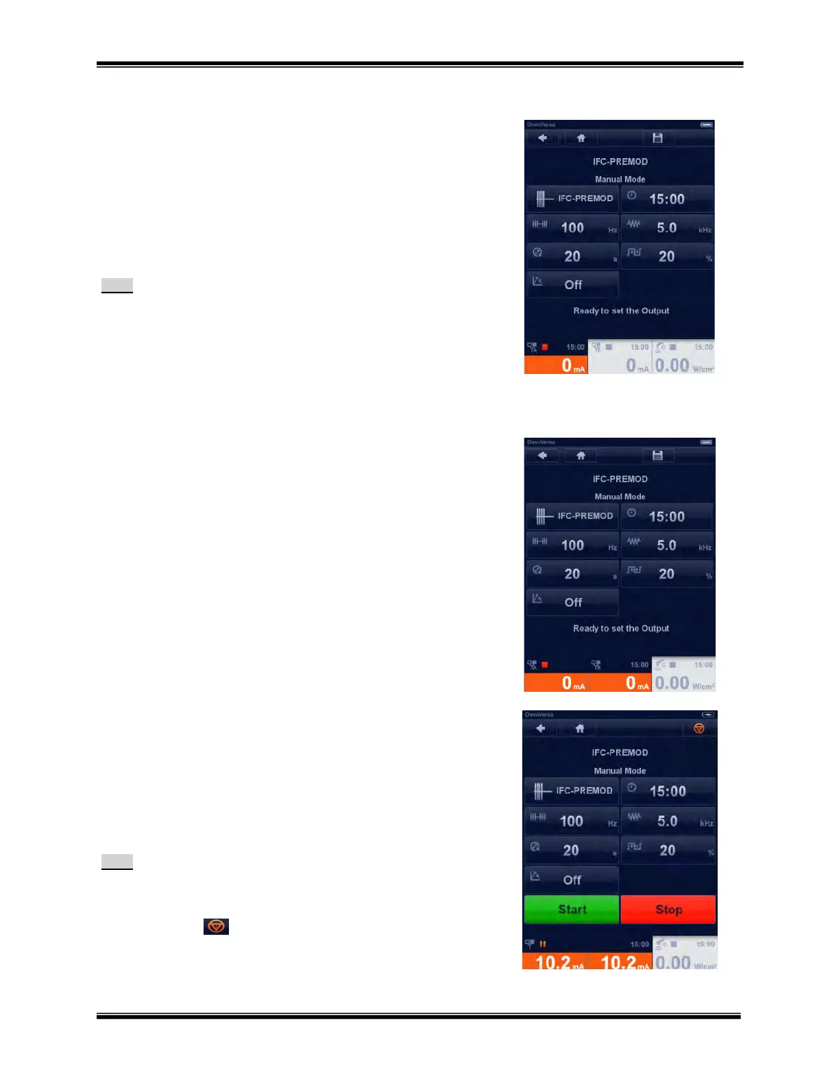 As soon as output intensity is increased the START and STOP buttons