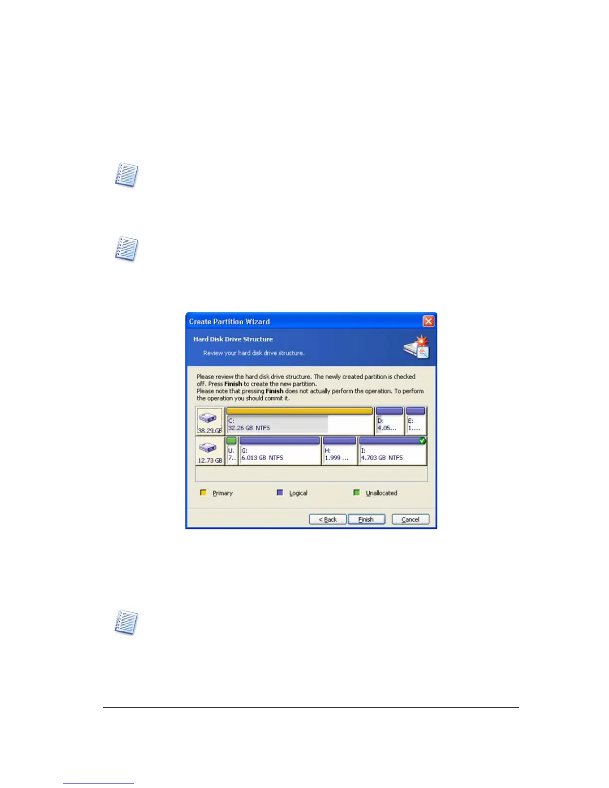 The last wizard page graphically shows you the new disk partition structure, including