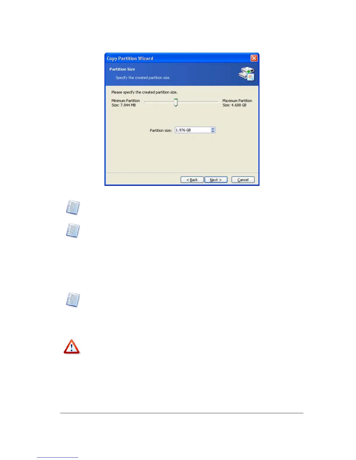 The page for partition copy size selection