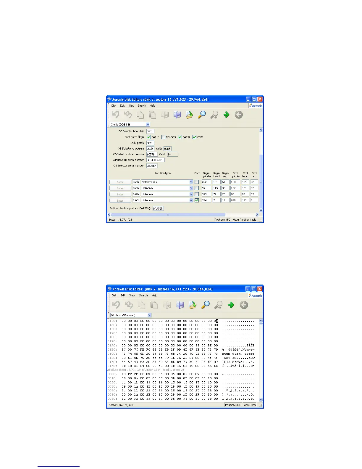 The next figure shows the partition table as a single dump (hexadecimal byte values are