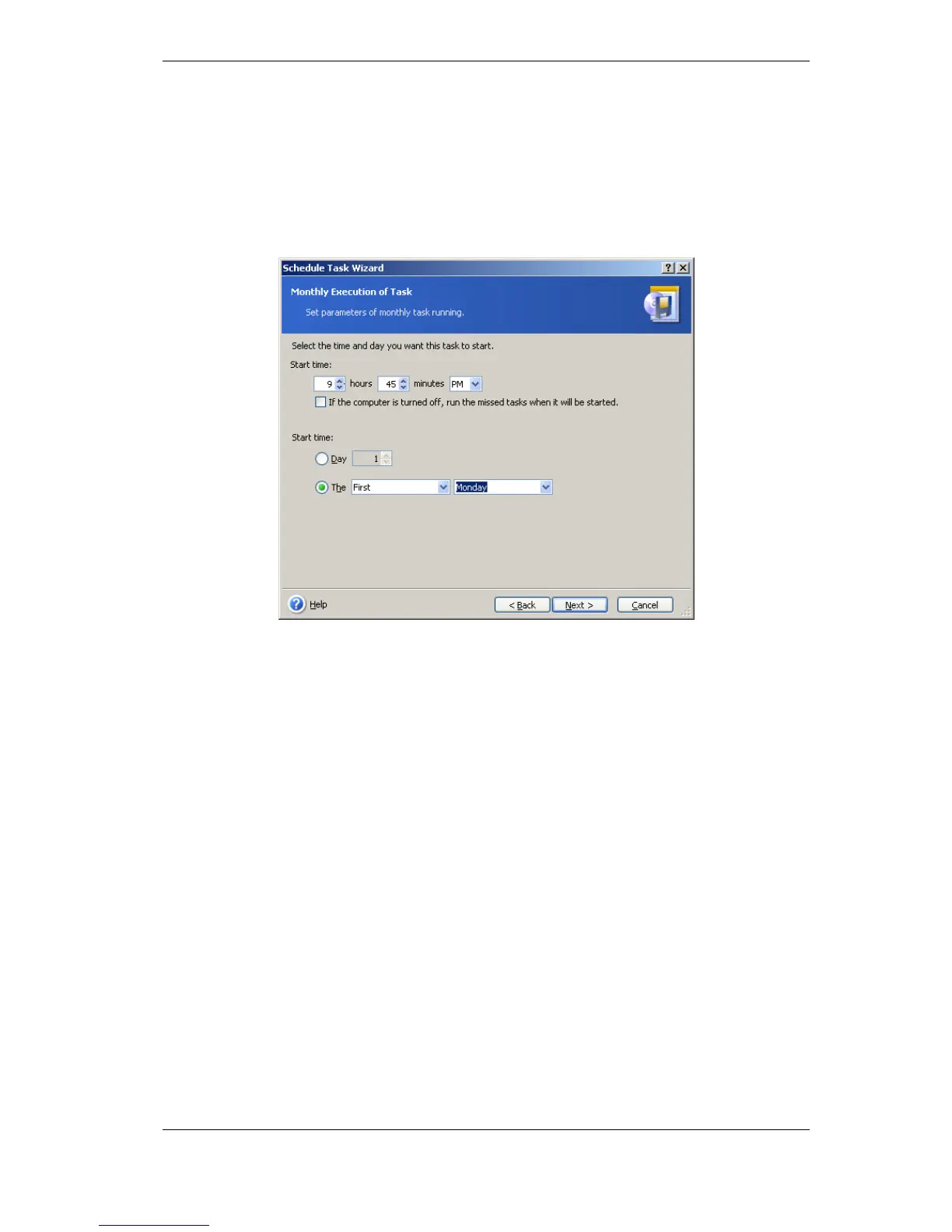 If you select monthly execution, set the Start time and days on which to execute the