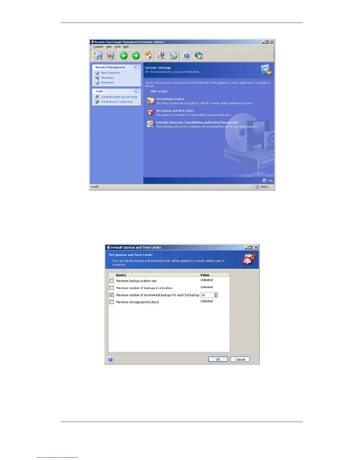 To enable Acronis Backup Server to process archives, schedule quotas/time limits check