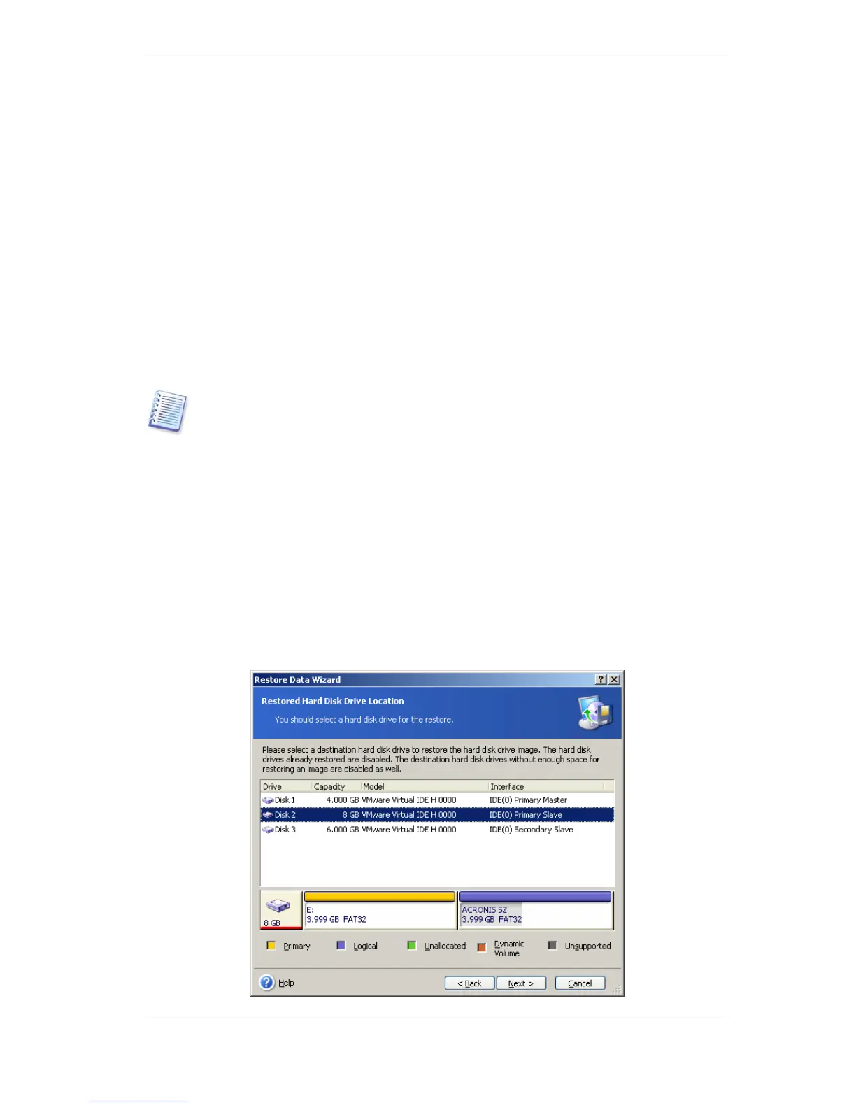 restore data to its initial location, to another disk/partition or to an unallocated space. The