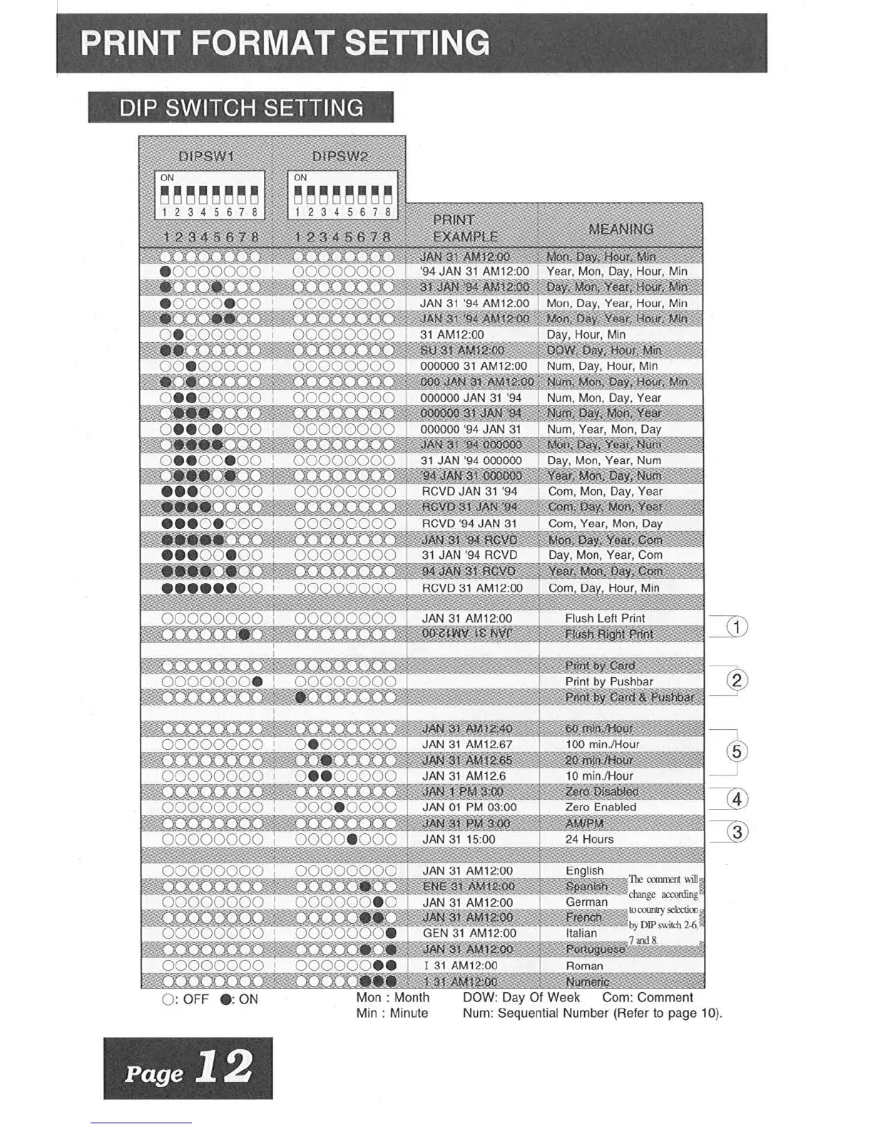Acroprint 175 - Print Format Settings; DIP Switch Settings for Print Formats