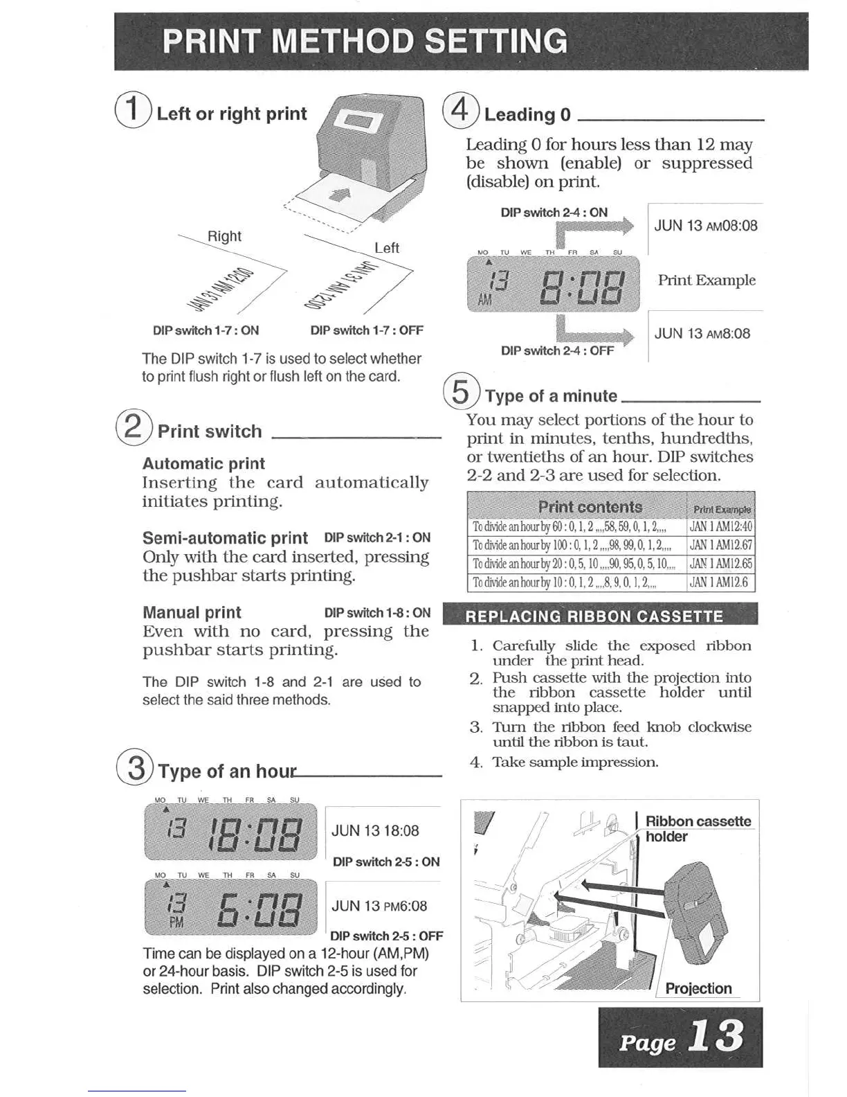 Acroprint 175 - Print Method Settings; Print Alignment and Trigger; Time Display and Minute Format; Ribbon Cassette Replacement