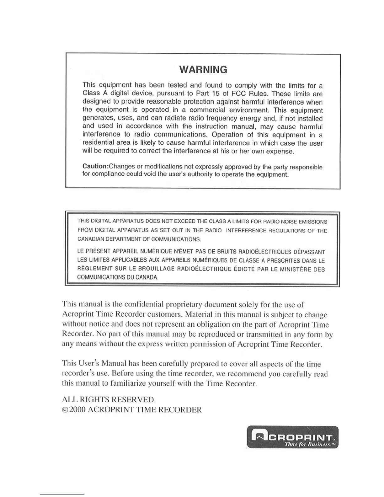 Acroprint 175 - Safety and Compliance Warnings