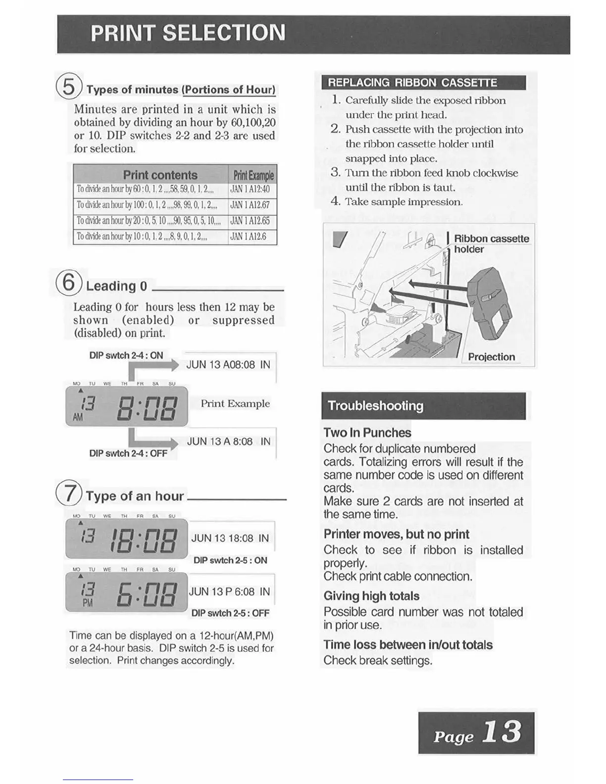Acroprint ATT310 - Replacing Ribbon Cassette; Troubleshooting; Types of Minutes; Leading 0;Type of an Hour