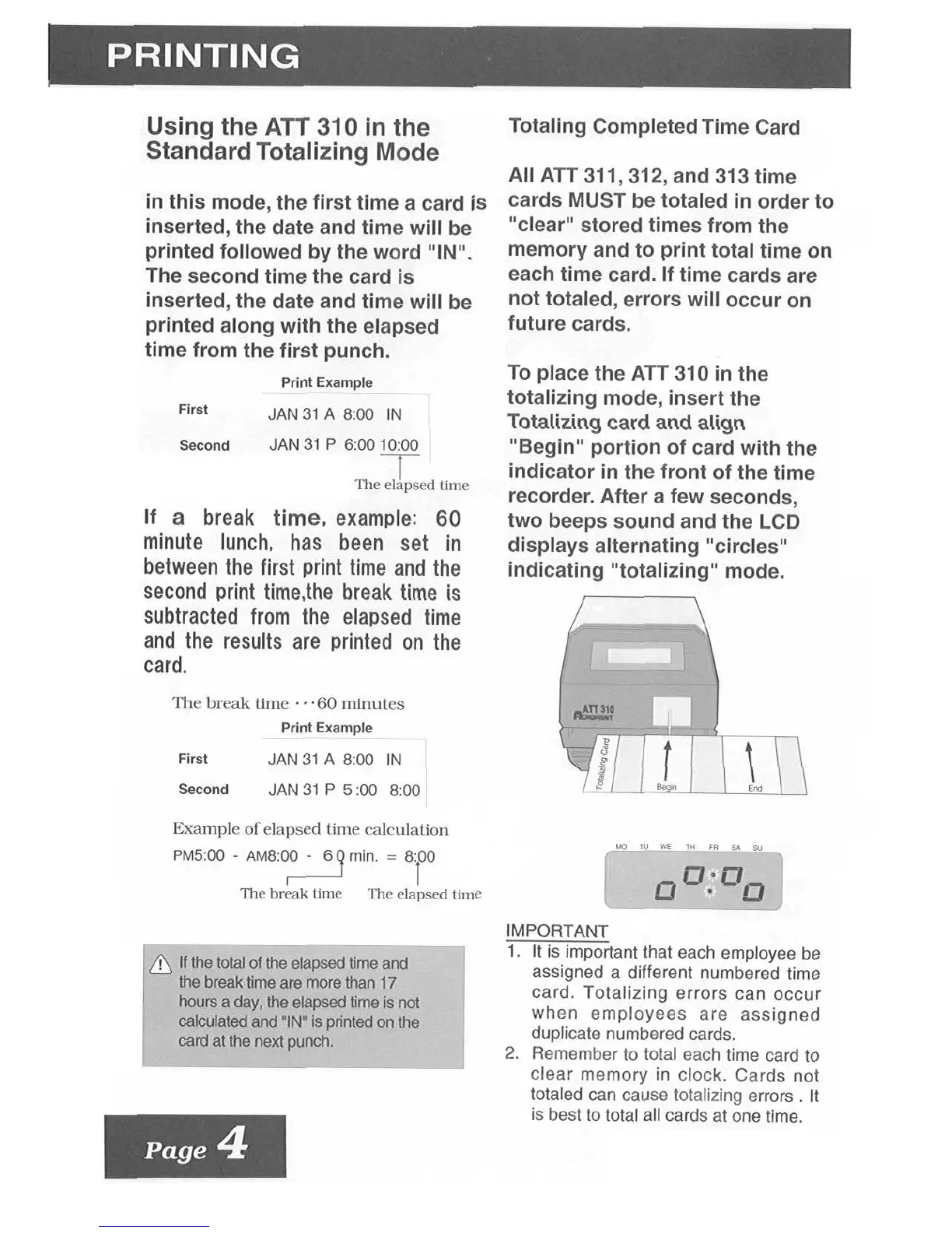 Acroprint ATT310 - Printing; Standard Totalizing Mode Printing; Totaling Cards and Mode Entry
