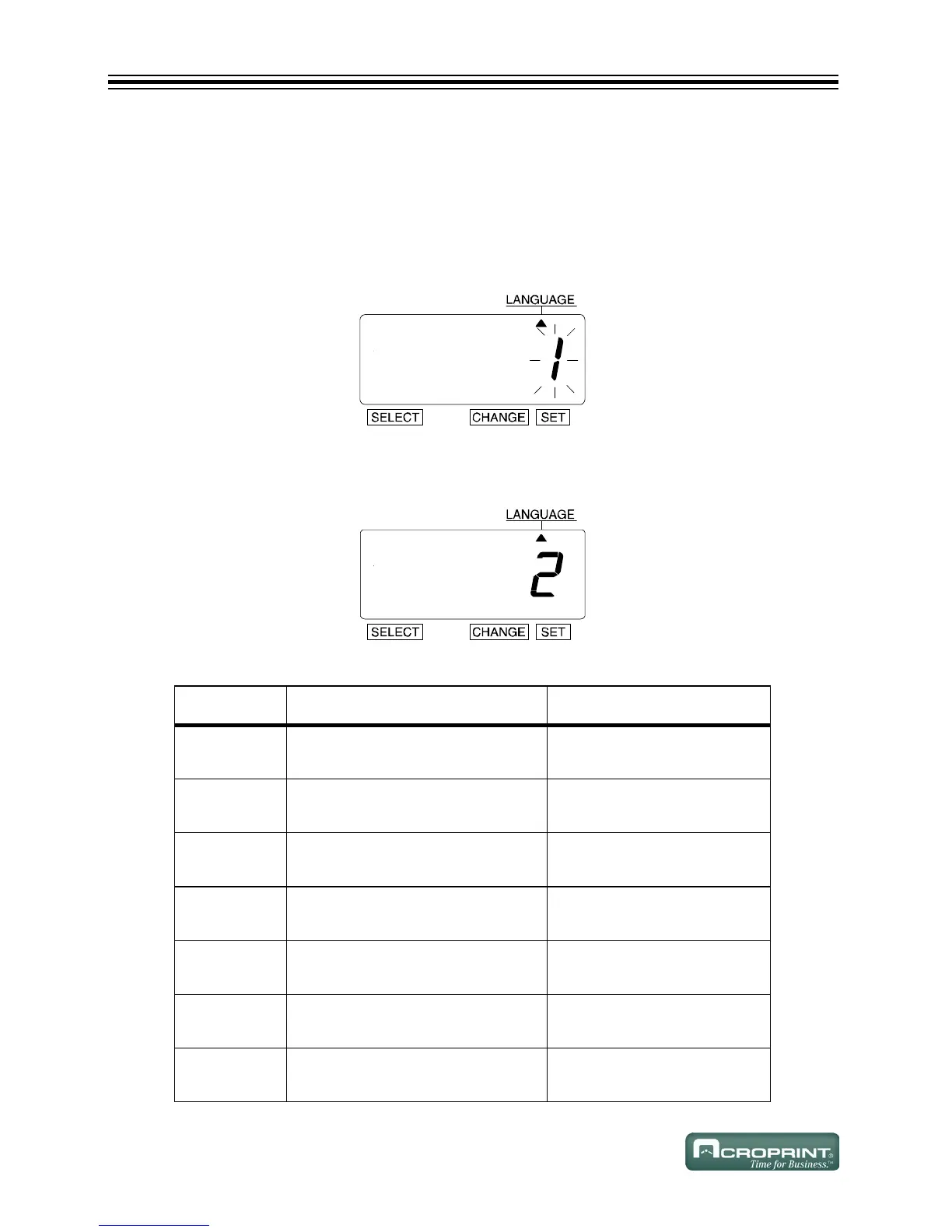 1. Press SELECT until the S is under the "LANGUAGE" mark.