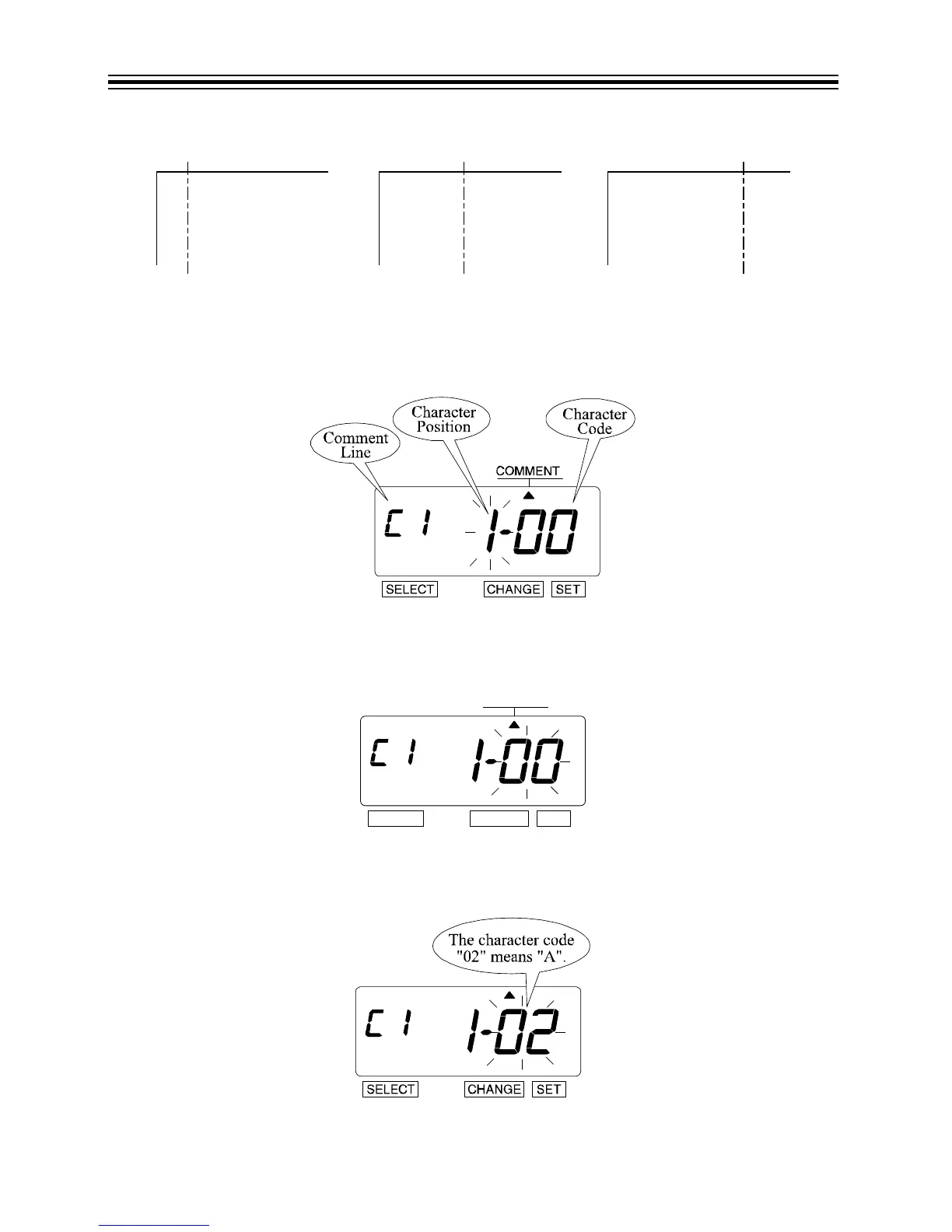 2. In this example, the 1st character is "A". Press CHANGE until the Character Code is"02" (A).