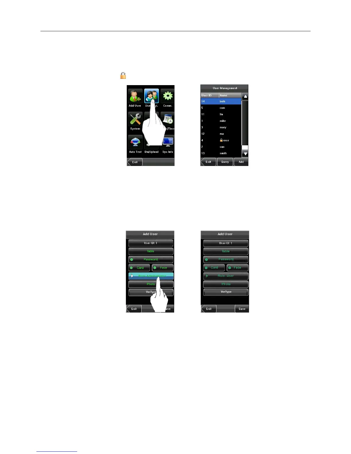 Press [User Mgt] on the main menu screen to display the user management screen. Users are listed in alphabetical