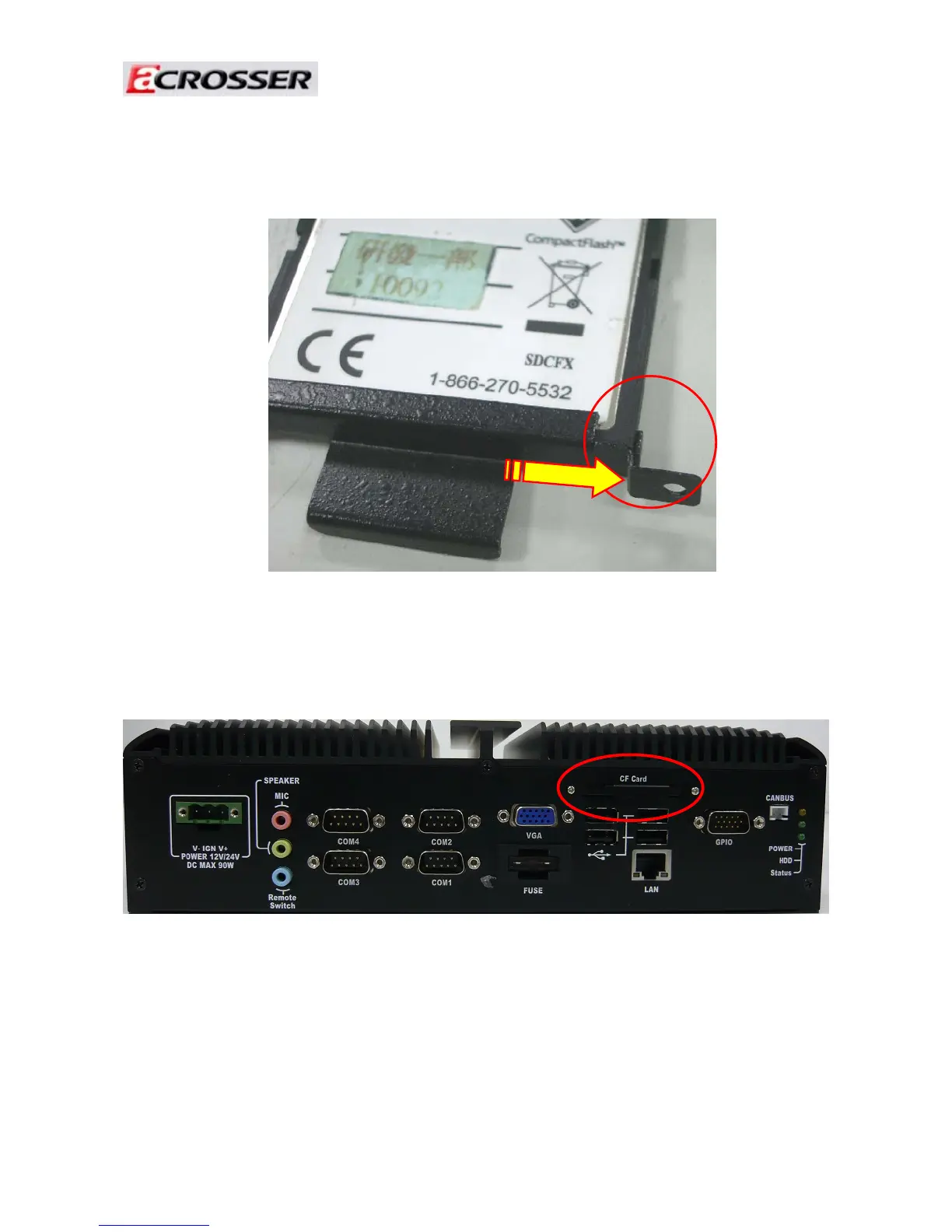 3. Push CF card to the bottom of bracket to stop the forwarding at the bend of