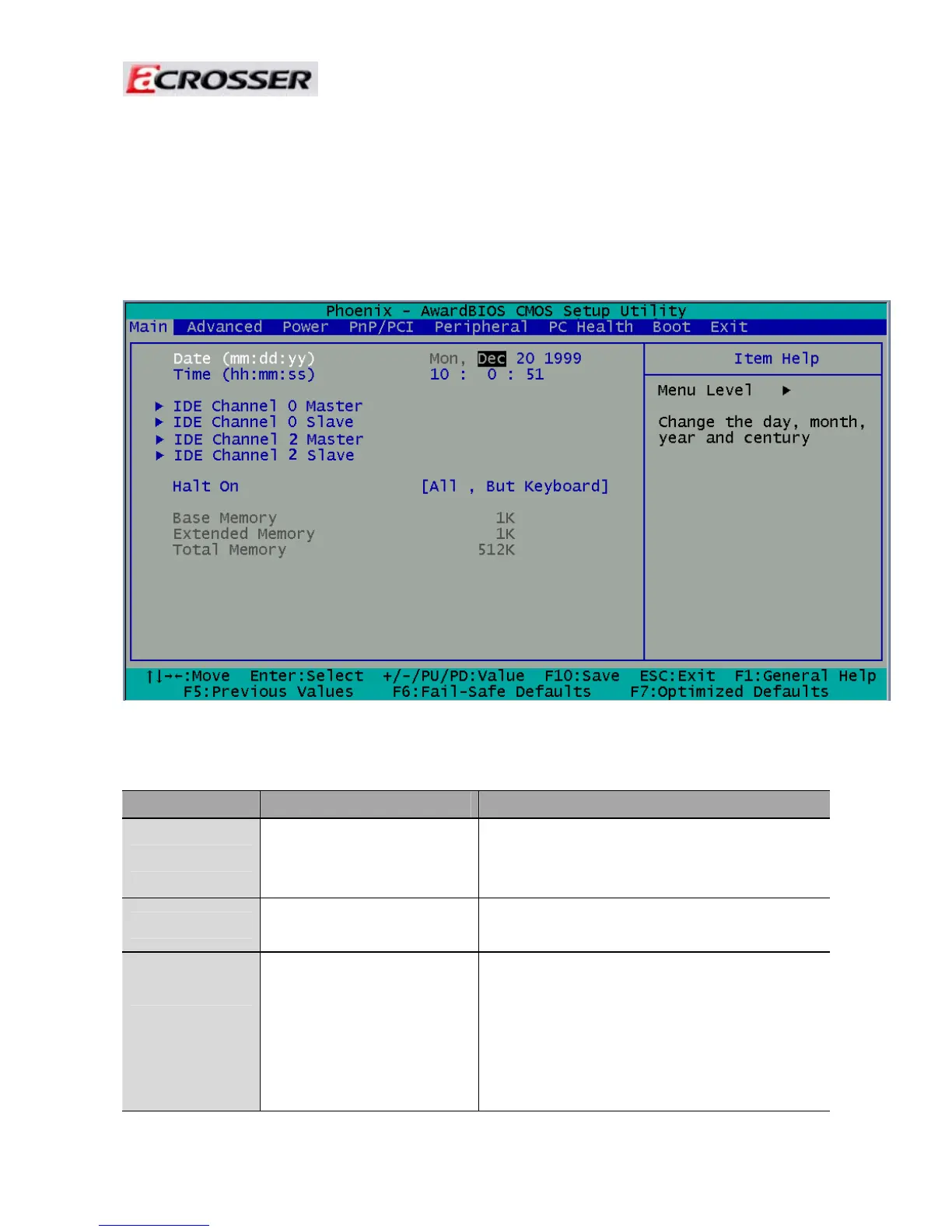 The BIOS setup main menu includes some options. Use the [Up/Down] arrow key to