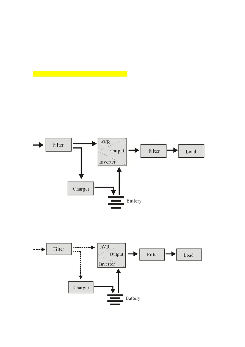 Når vekselstrøm svikter, vil batteriet gi strøm til omformeren og så passere filteret og