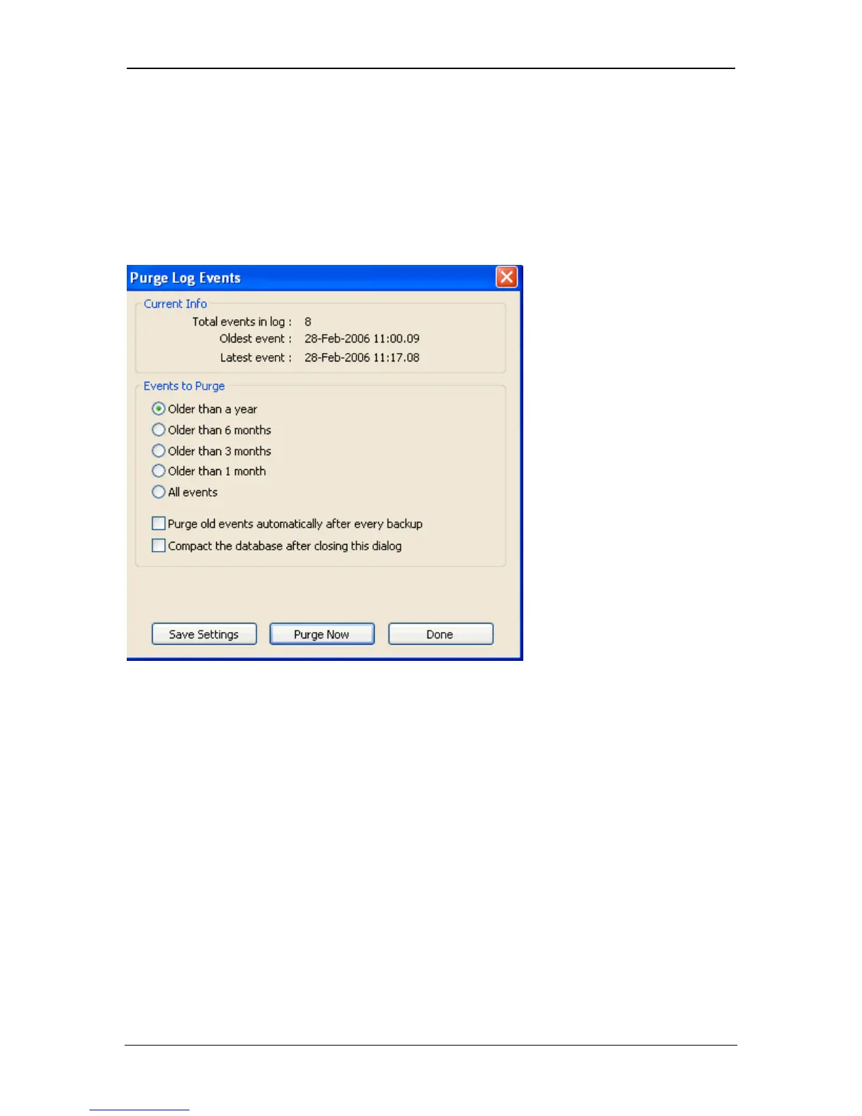 The purge log events dialog allows older events to be removed from the system
