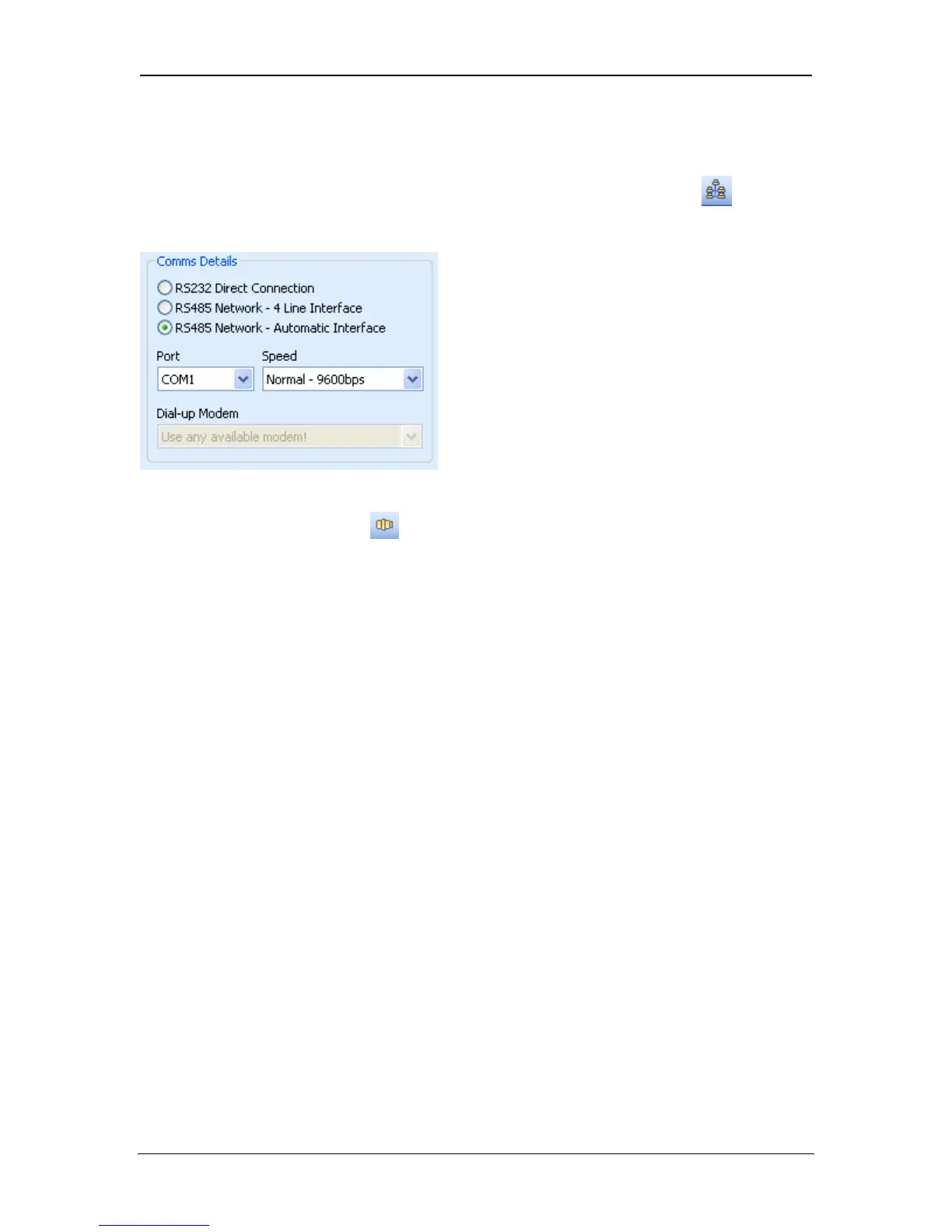 configuration settings are COM1, RS485 Automatic Interface, normal speed