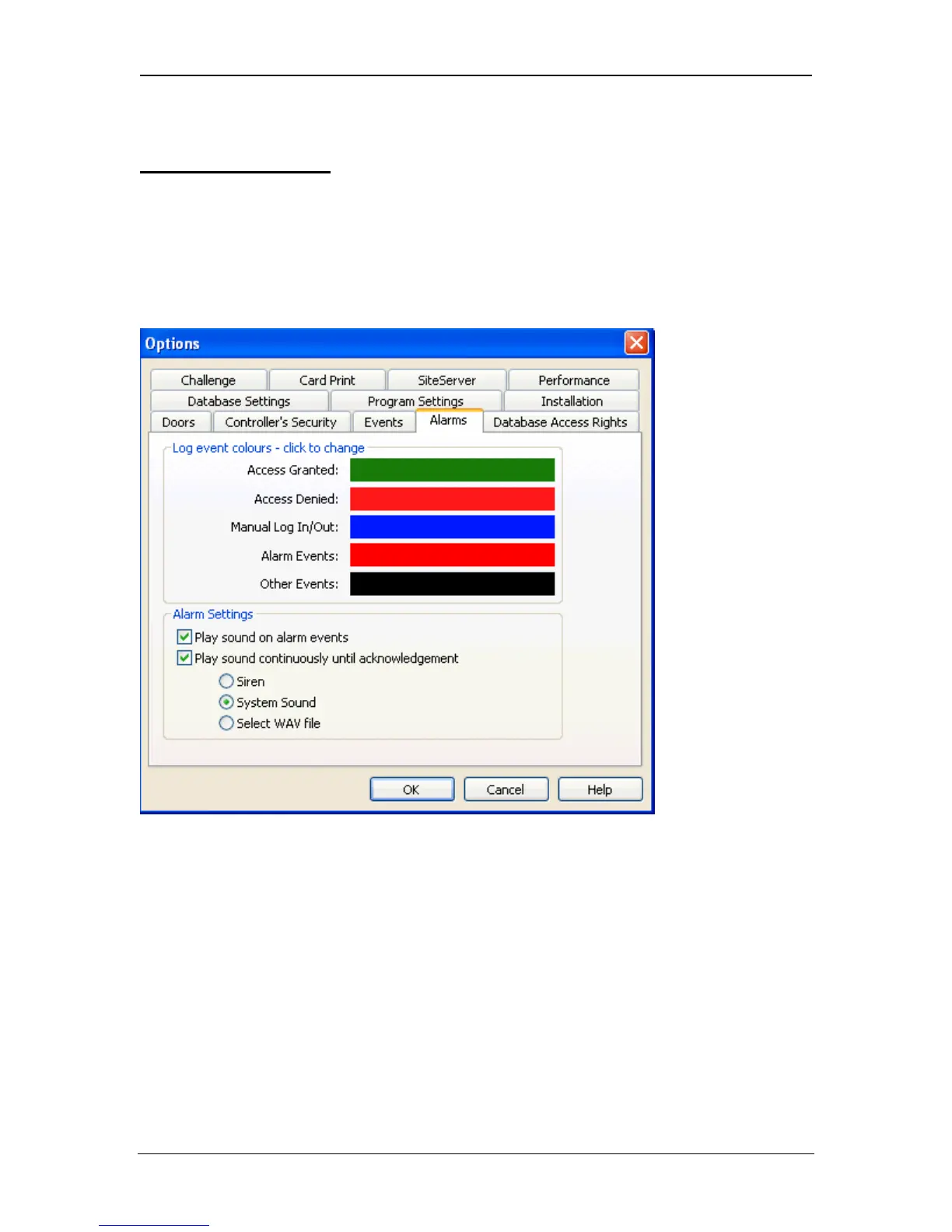 The Alarms/Colours page allows the colour of displayed log events to be