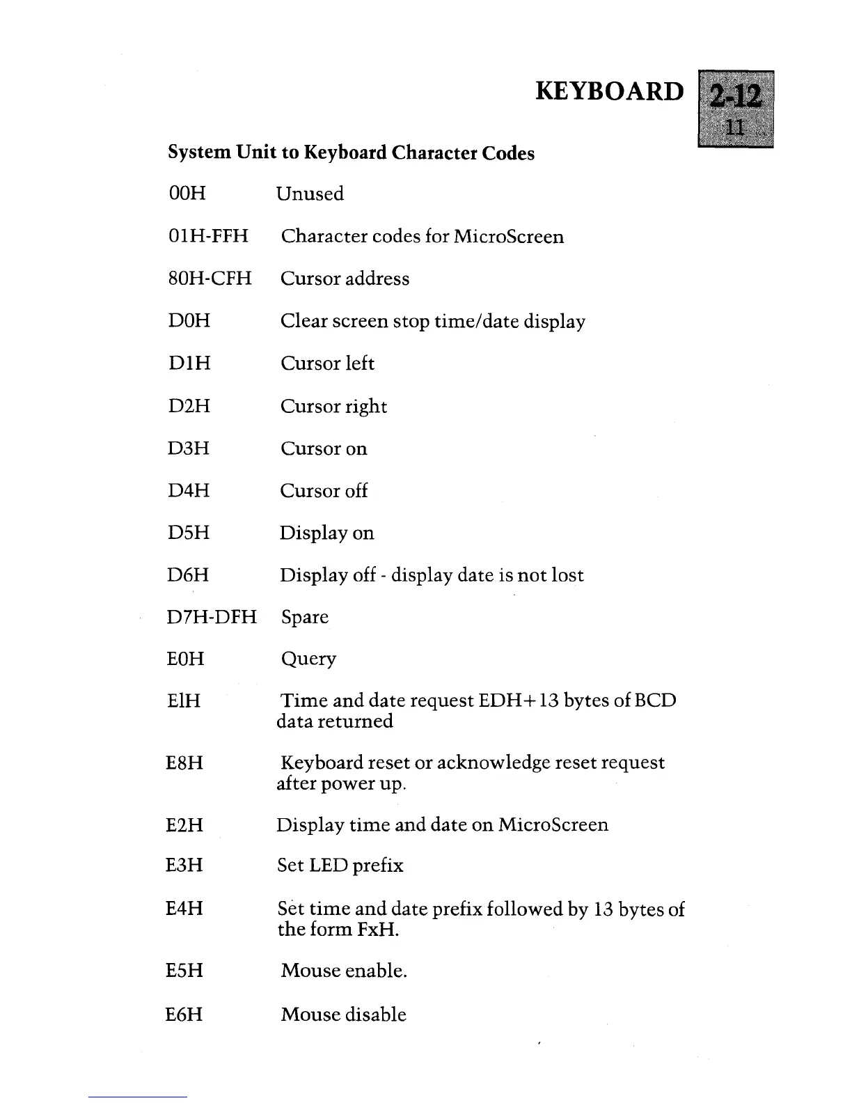 ACT apricot - System Unit to Keyboard Character Codes