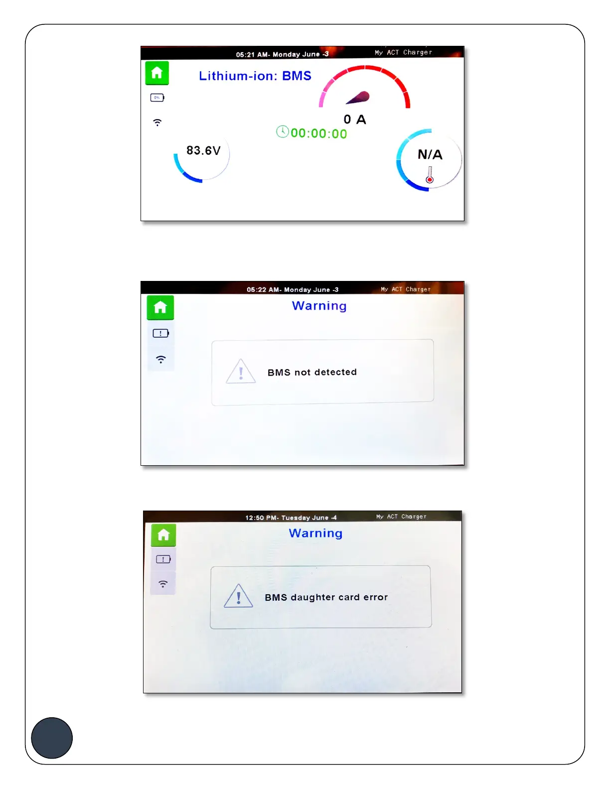 If the charger doesn’t detect the BMS on the battery the following screen will be displayed after