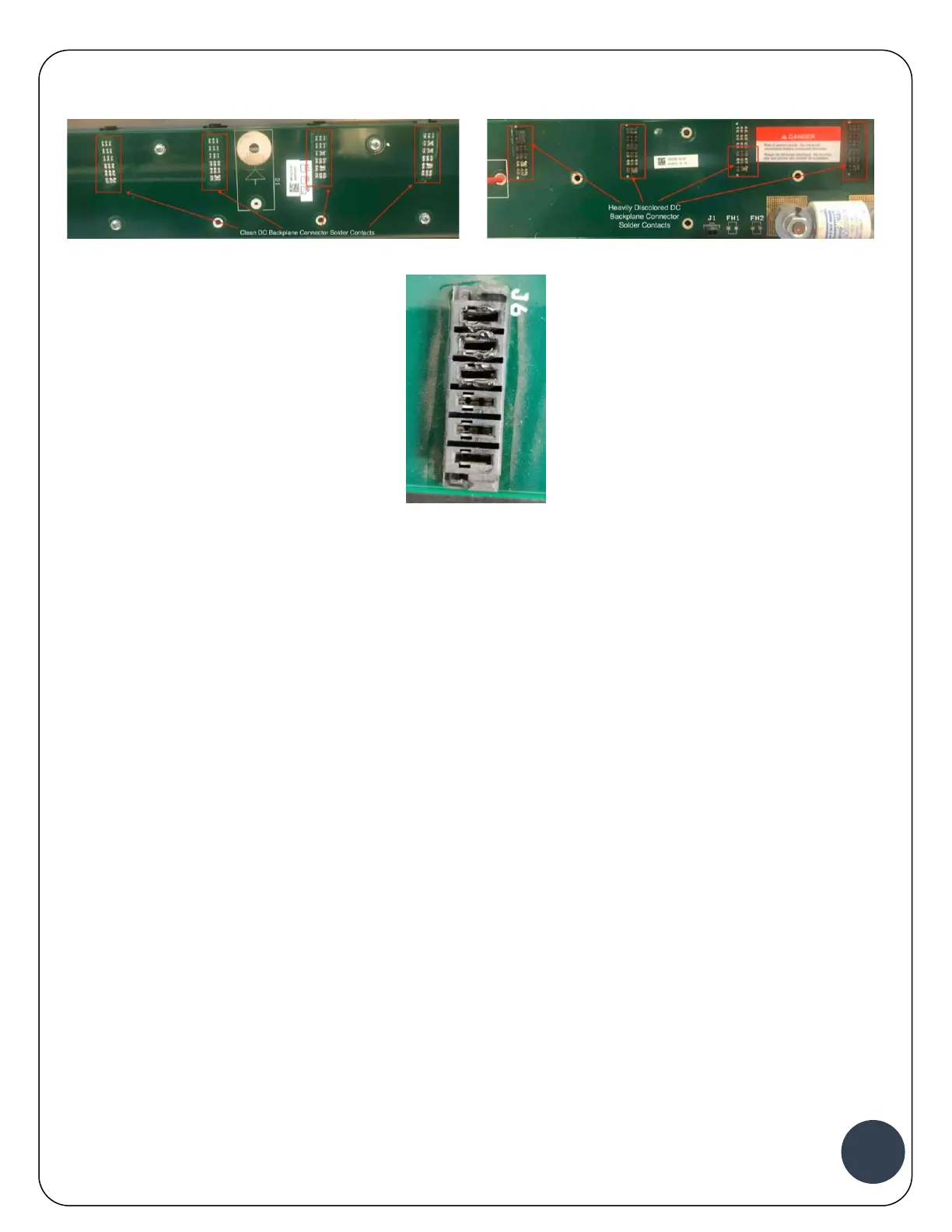 Remove the charger back cover and inspect the DC backplane for any discoloration or damage. Report any