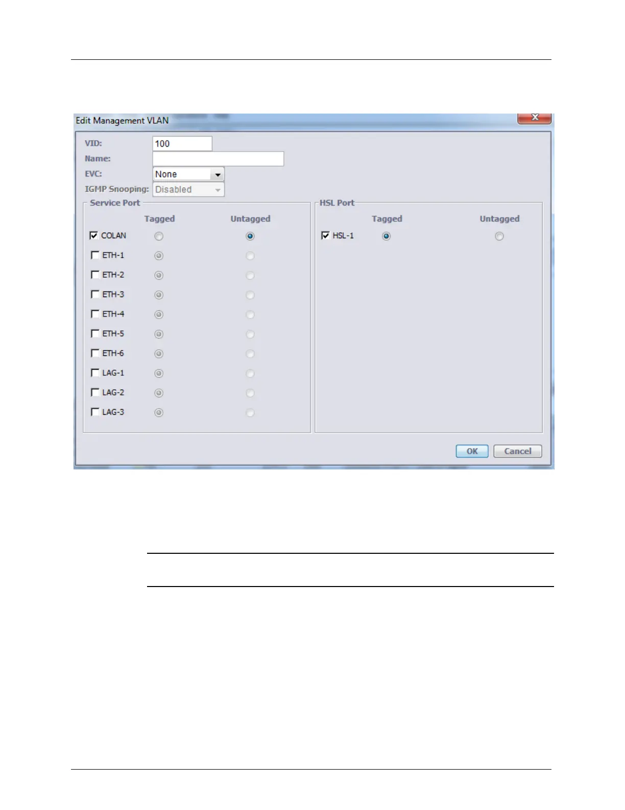 8. In the HSL Port area, select the HSL check box (only Tagged membership option is