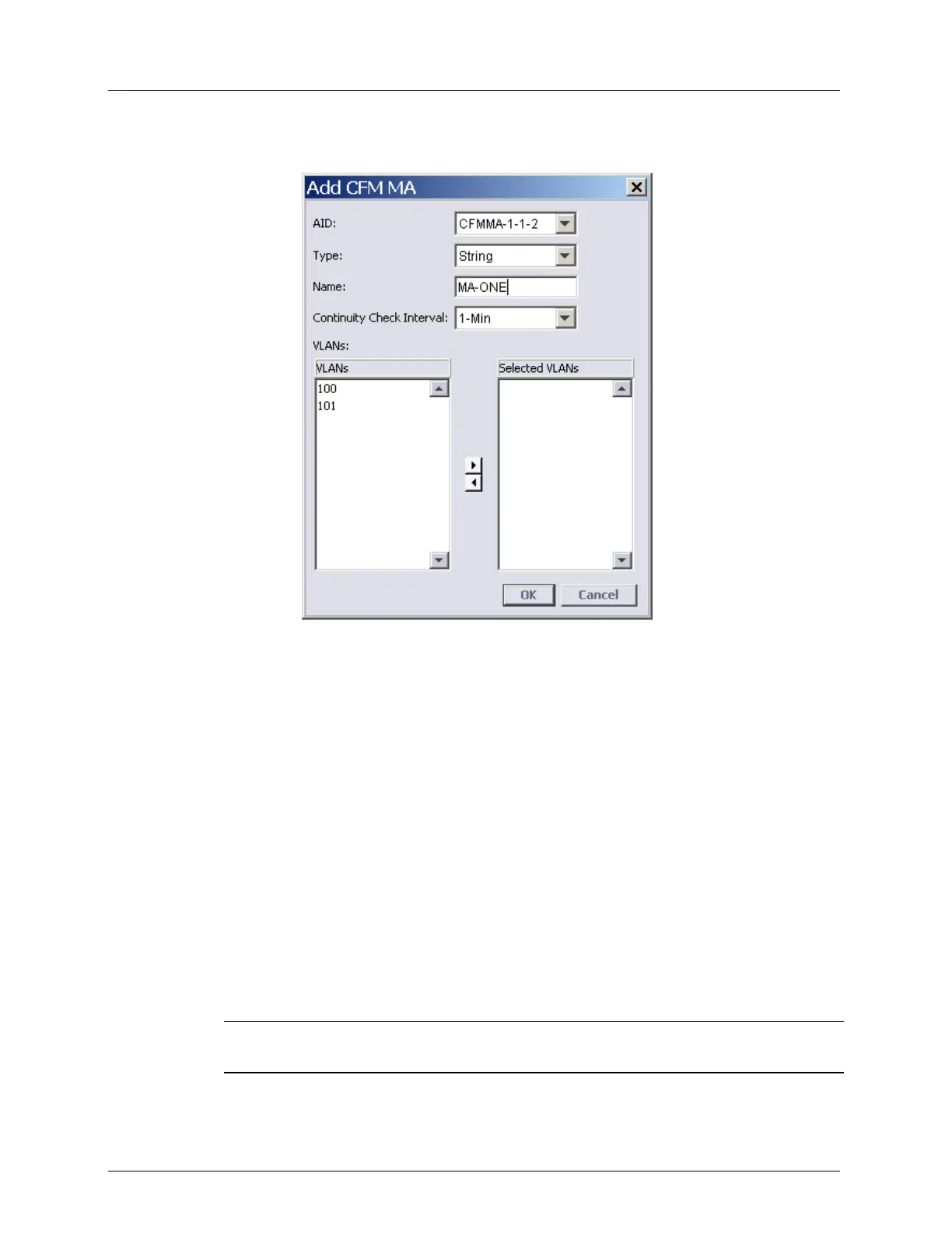 2. In the CFM Domain pane, Associated MAs area, click Add MA. The following dialog