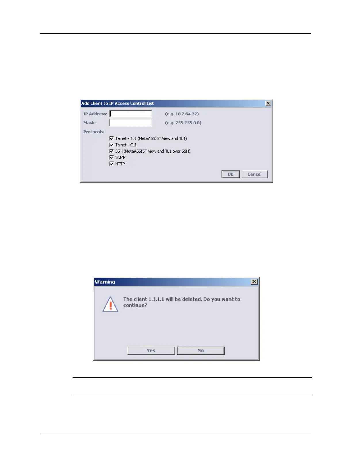 NOTE: For each deleted client, all ongoing sessions from that client are aborted (if IP Access Control