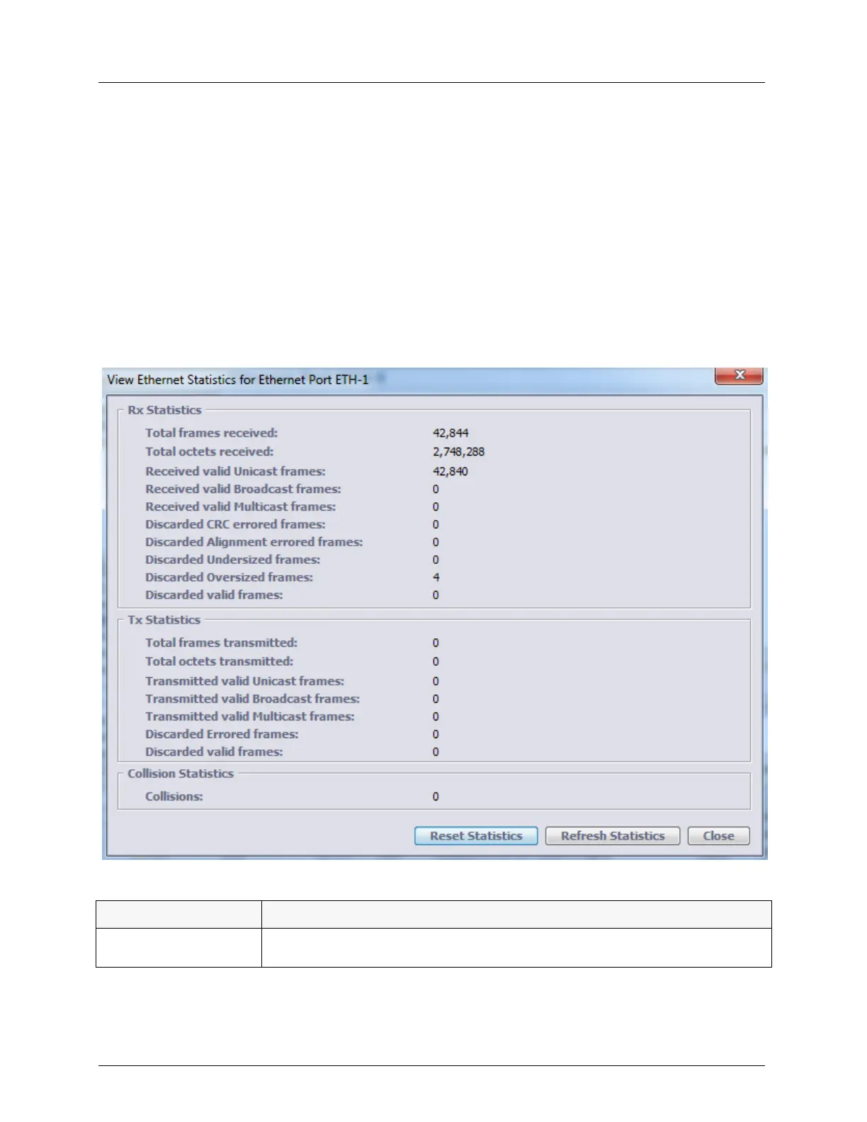 View Statistics button. The Ethernet Statistics dialog appears. Use the Reset and Refresh