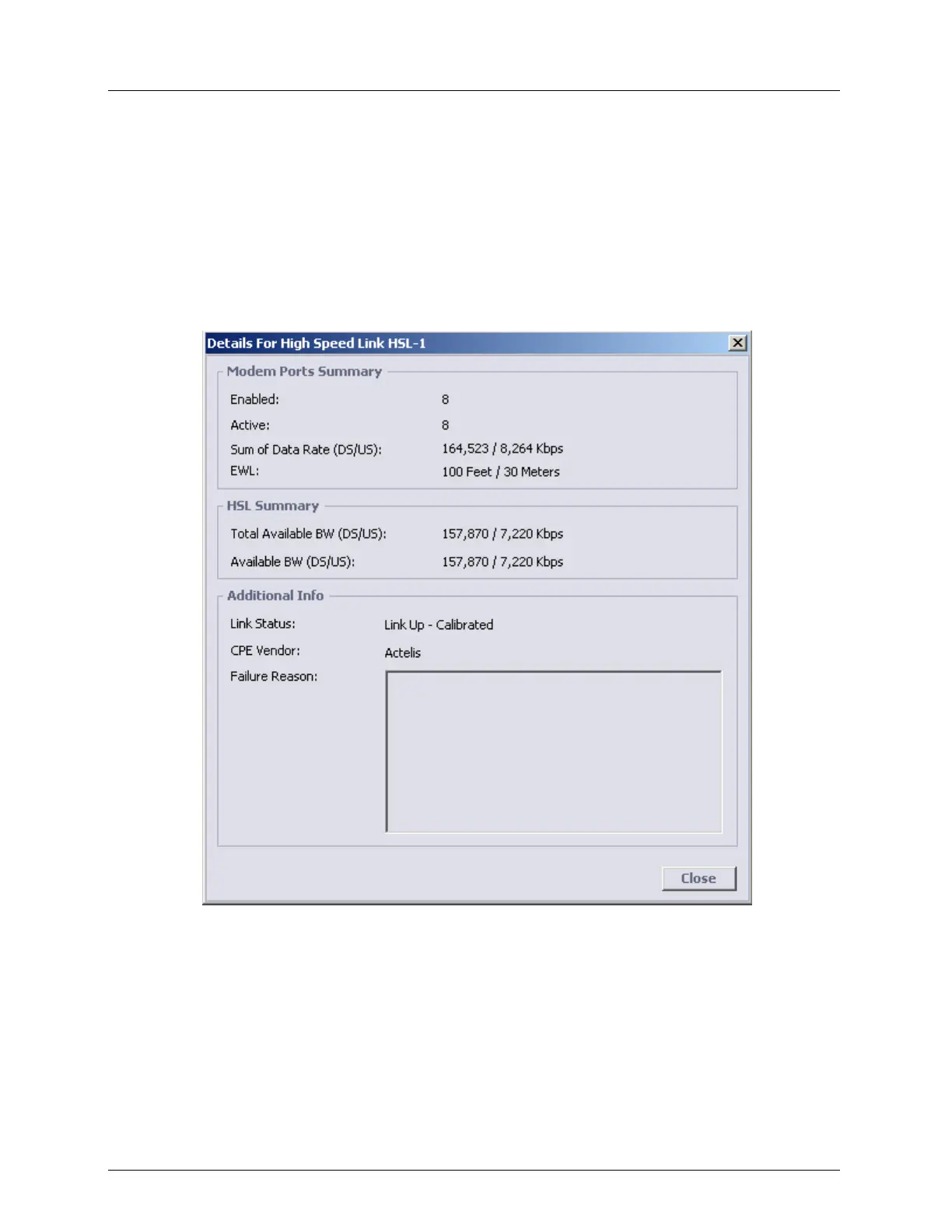 The HSL Details pane provides information on the modem ports, calibration parameters and
