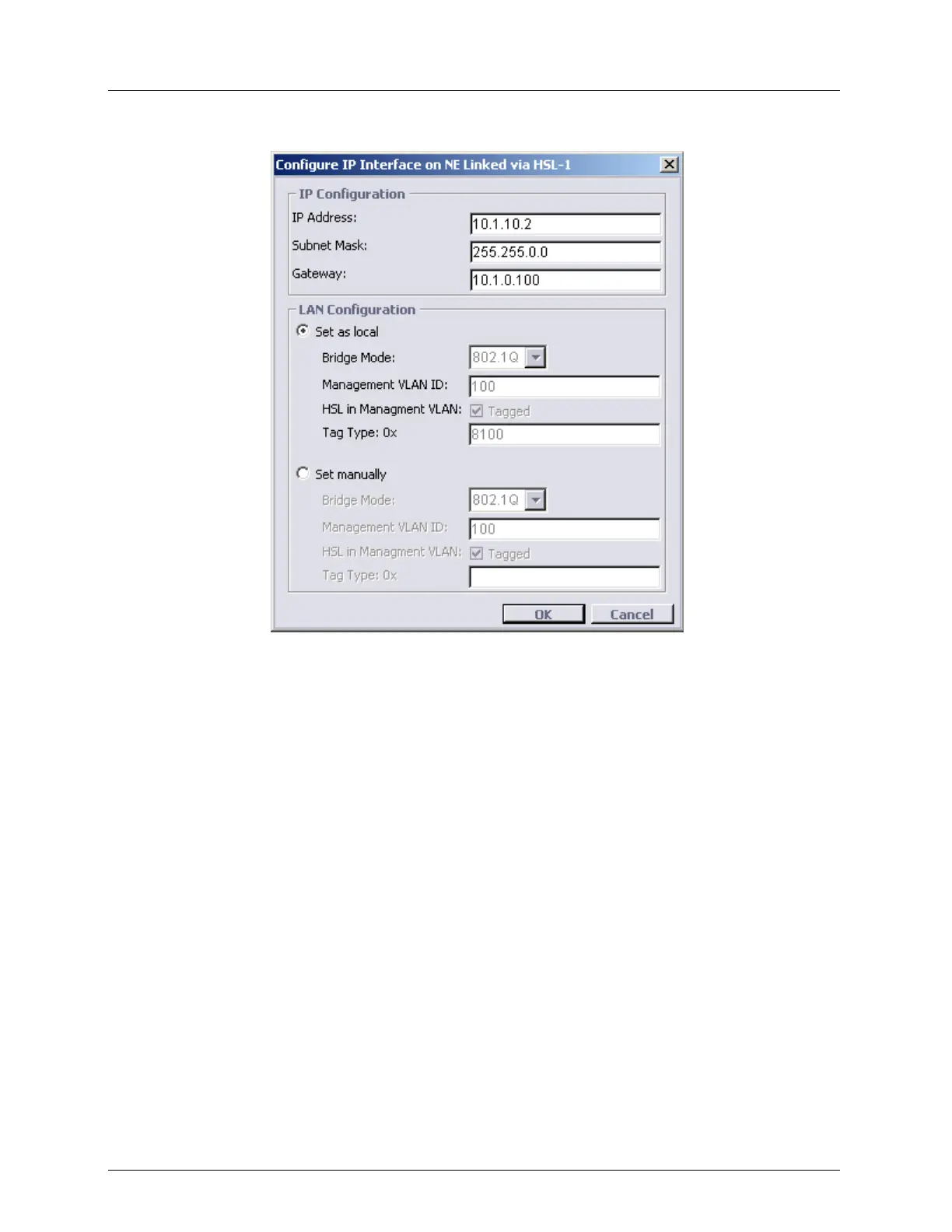 Set manually - initially displays the configuration of the remote NE. The parameters